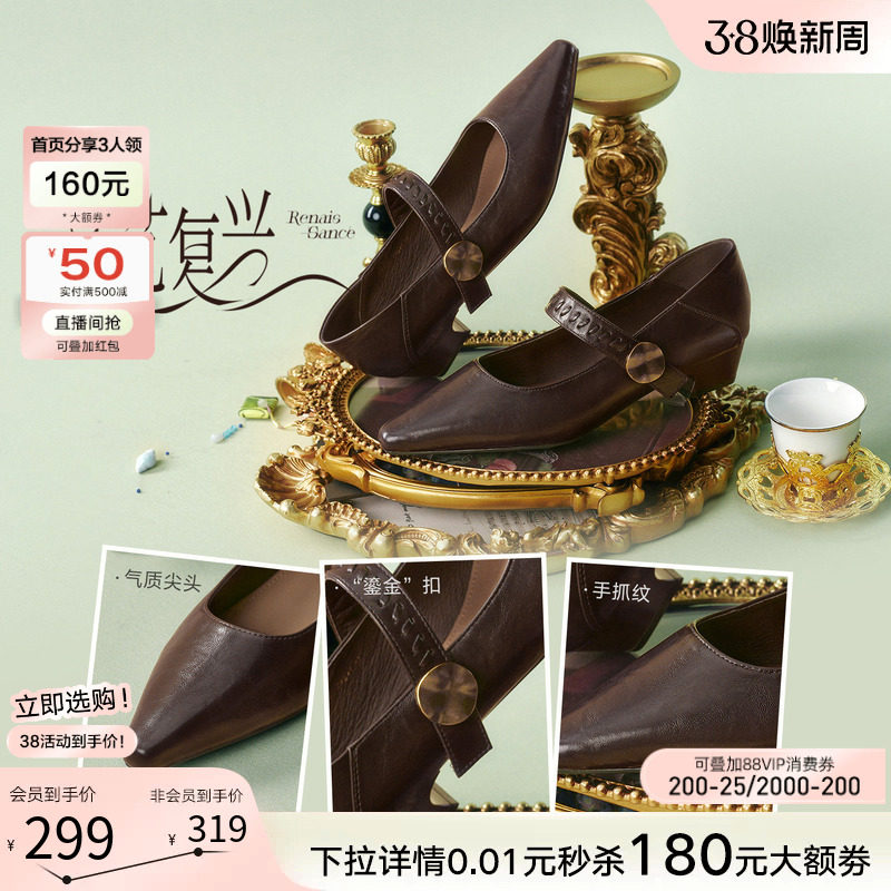 百思图2026春季商场新款尖头粗跟玛丽珍鞋小皮鞋女单鞋F5177AQ6