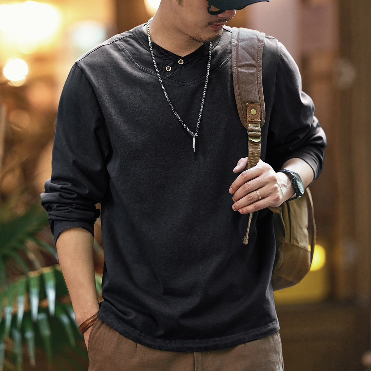 格蓝鹿美式复古重磅黑色长袖t恤男秋季潮牌宽松纯棉百搭V领打底衫