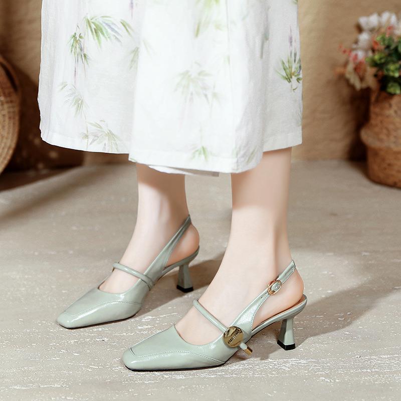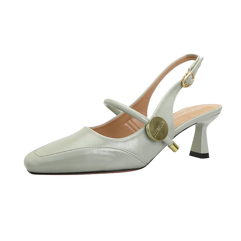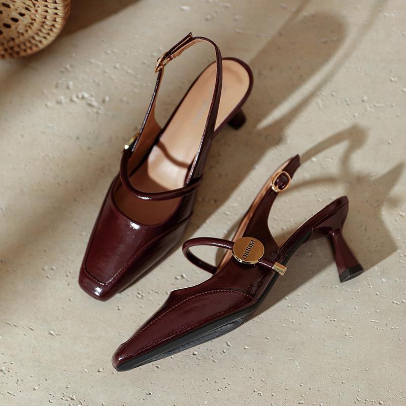 法式包头凉鞋后绊带高跟鞋女细跟2025新款夏季酒红色方头后空单鞋