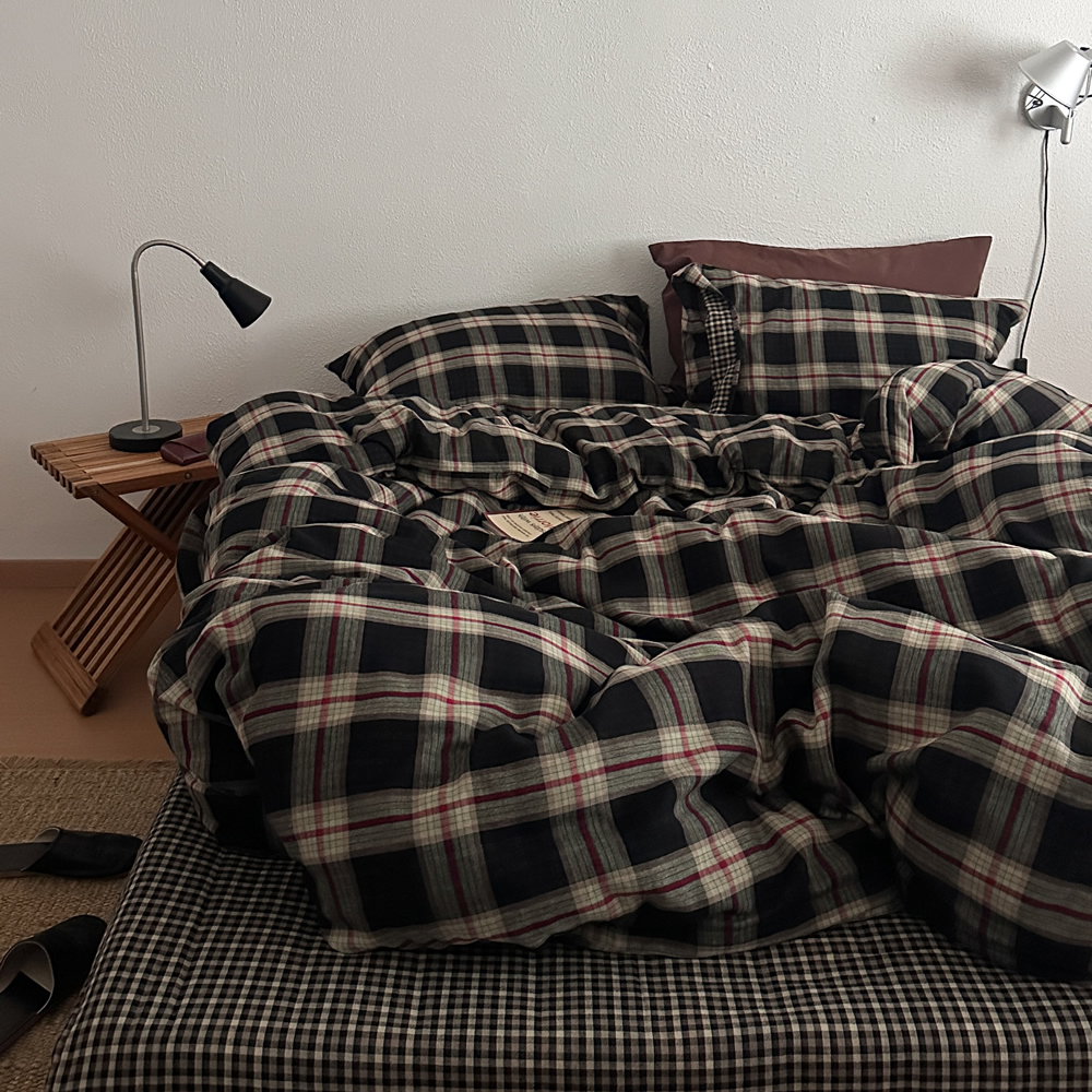 复古中古格子软糯柔软皱皱纱全棉四件套纯棉双层纱被套床笠款床品