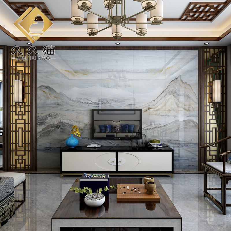 中式石材大板瓷砖背景墙胡桃木客厅F电视墙实木花格护墙板橡木格