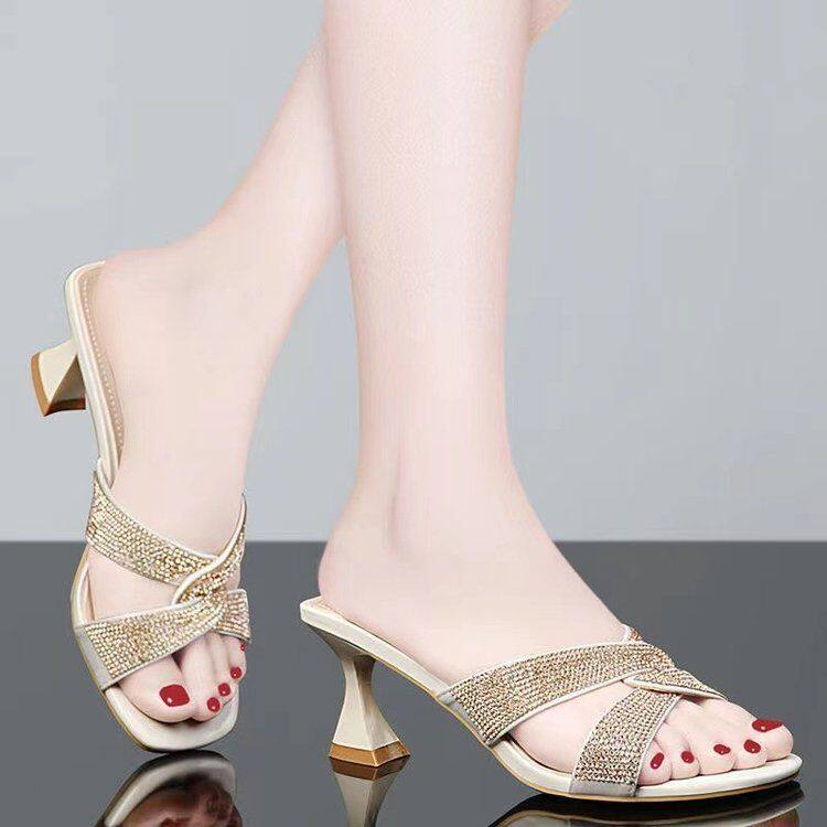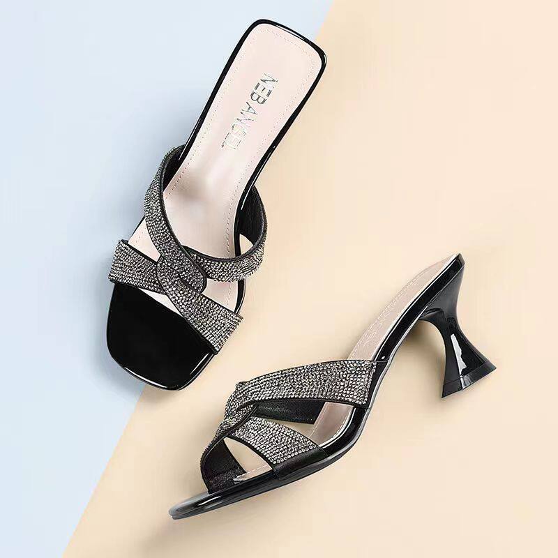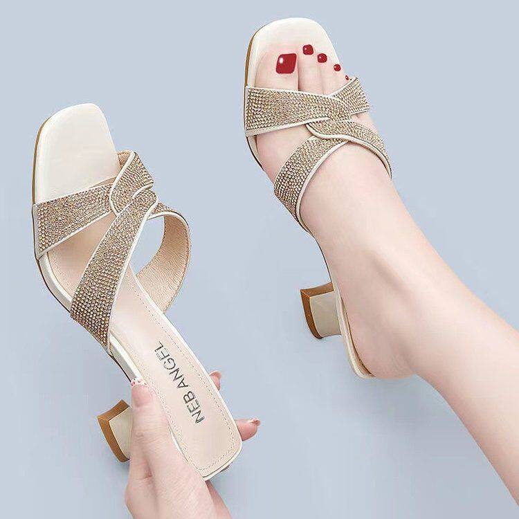 大东妞粗跟拖鞋女2025夏季新款凉鞋女中跟一字拖时尚百搭水钻高跟