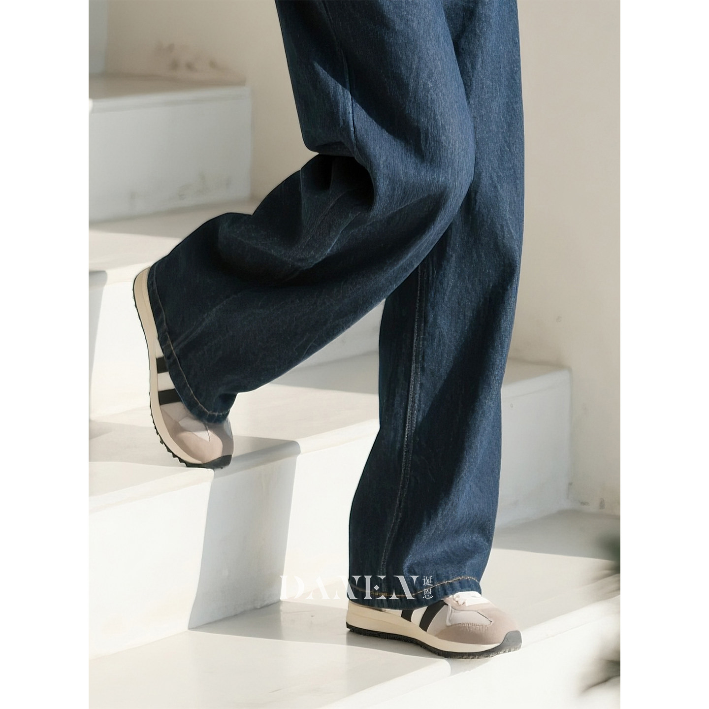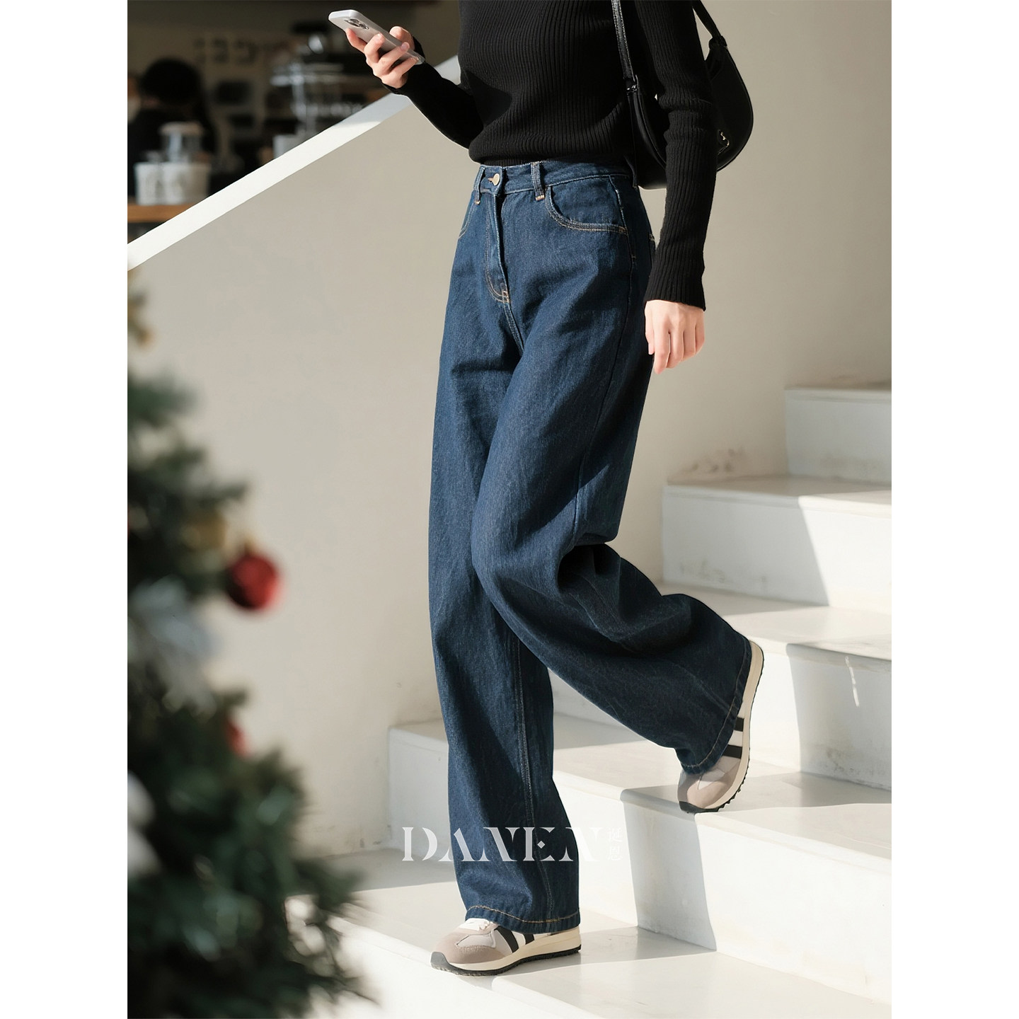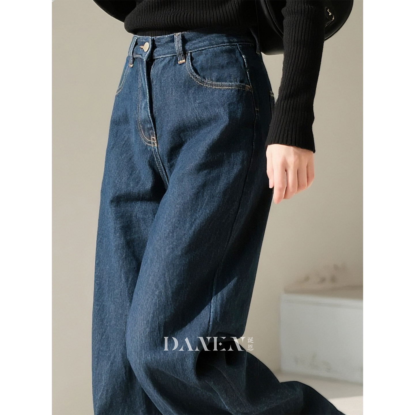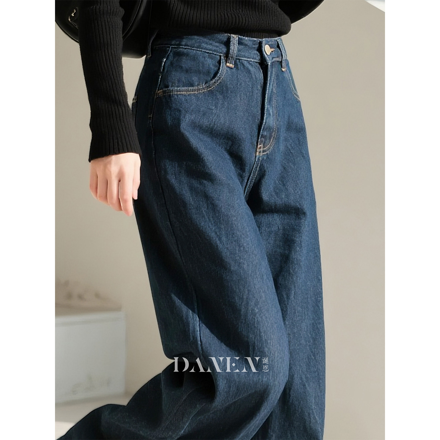 深蓝色薄绒牛仔阔腿裤女2025年秋冬新款复古高腰薄绒百搭长裤