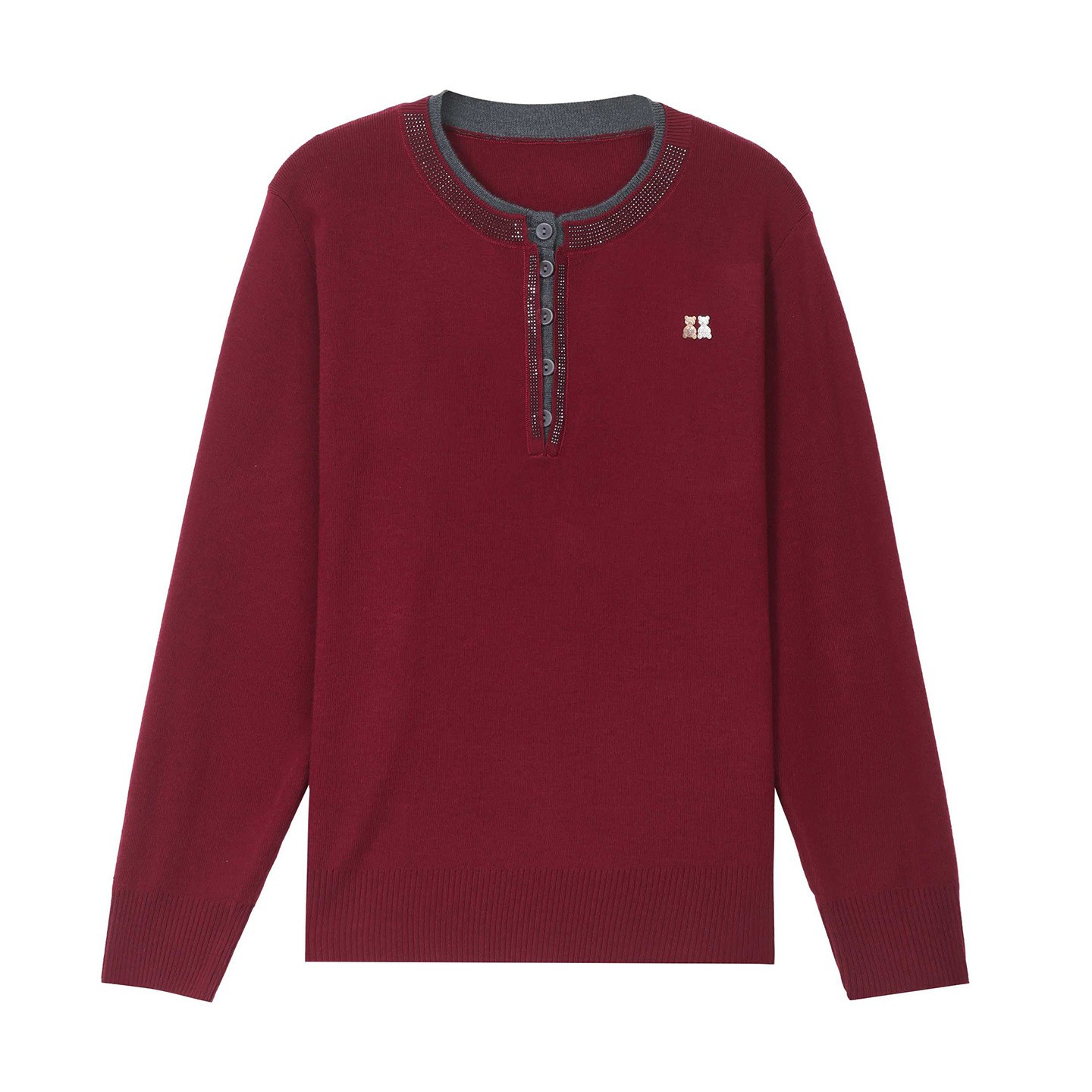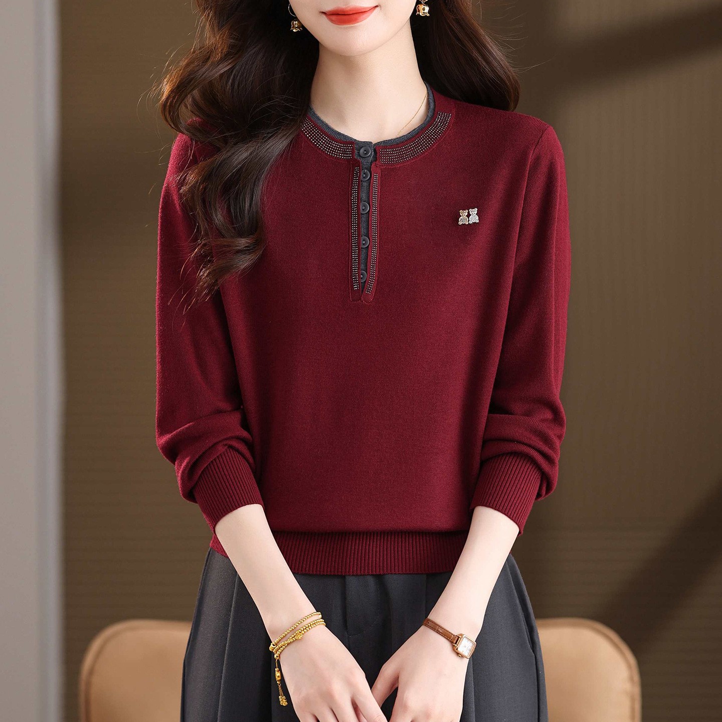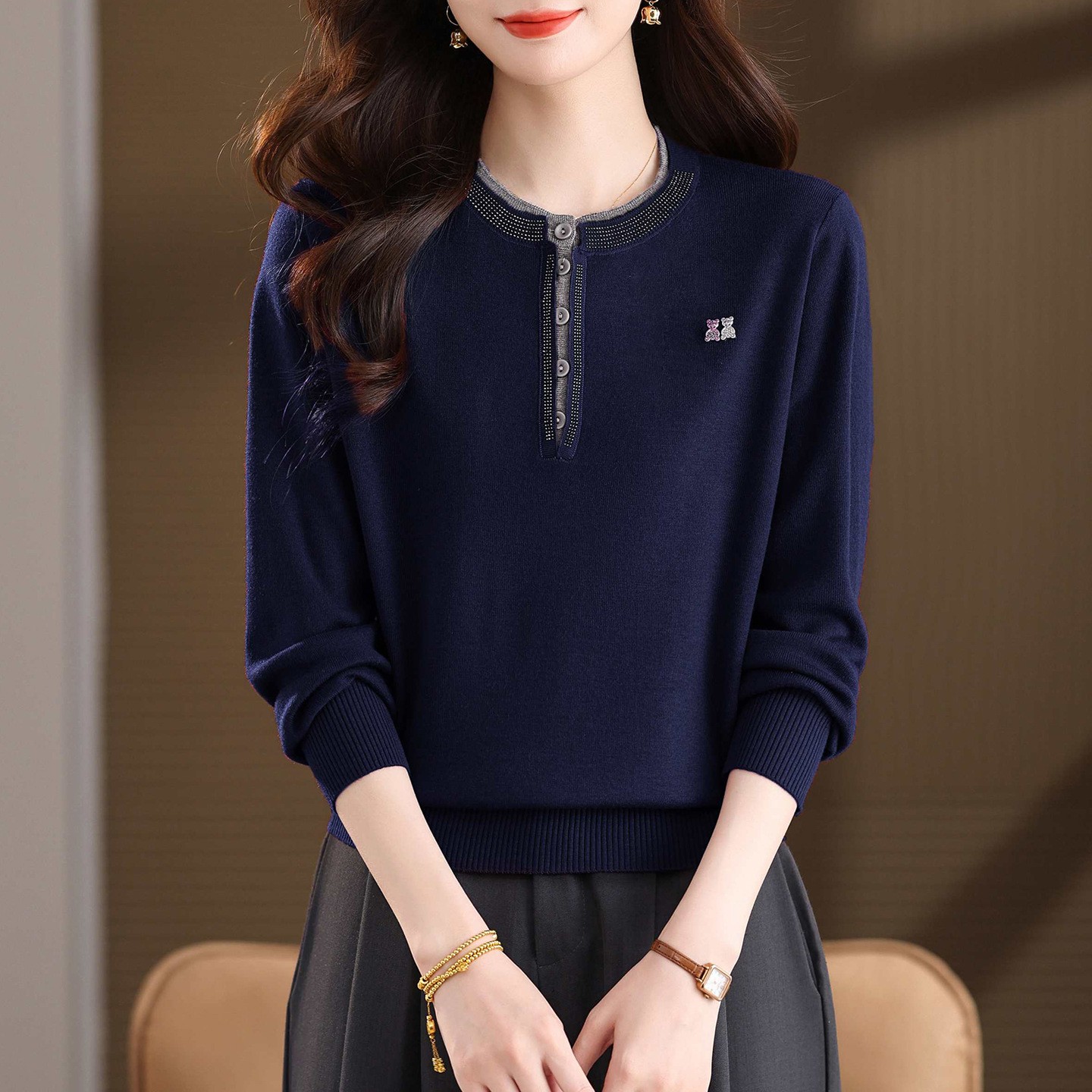 圆领撞色女士毛衣秋冬2025新款设计感长袖针织打底衫洋气宽松上衣