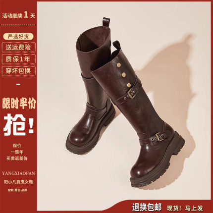 真皮版美拉德长筒靴2026新款大码棕色粗跟厚底不过膝骑士靴女粗腿