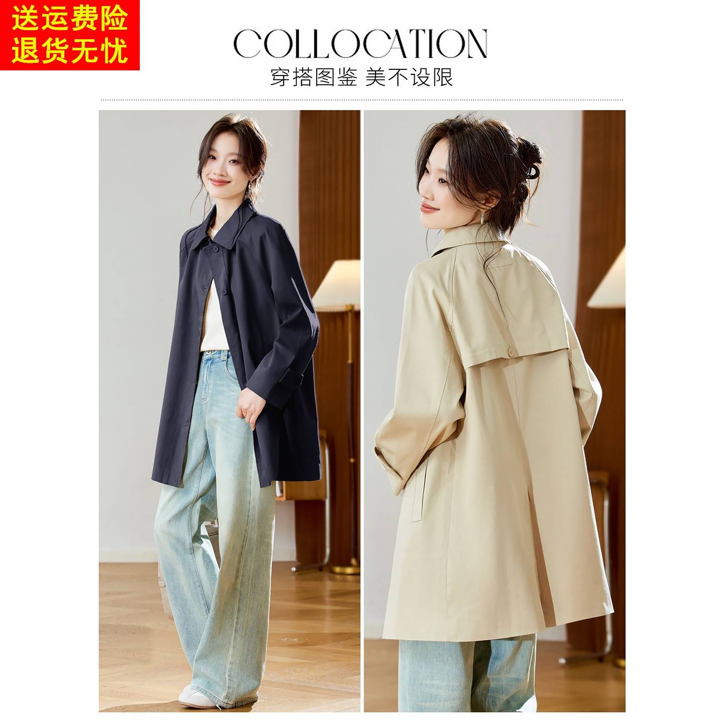 通勤风翻领风衣外套女秋季中长款卡其色小个子宽松显瘦插肩袖大衣
