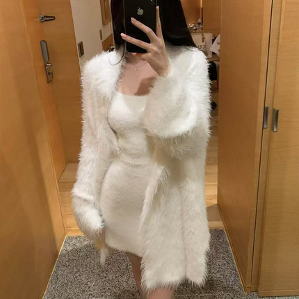 【5折】 白色针织开衫毛绒背心短裙仿水貂毛
