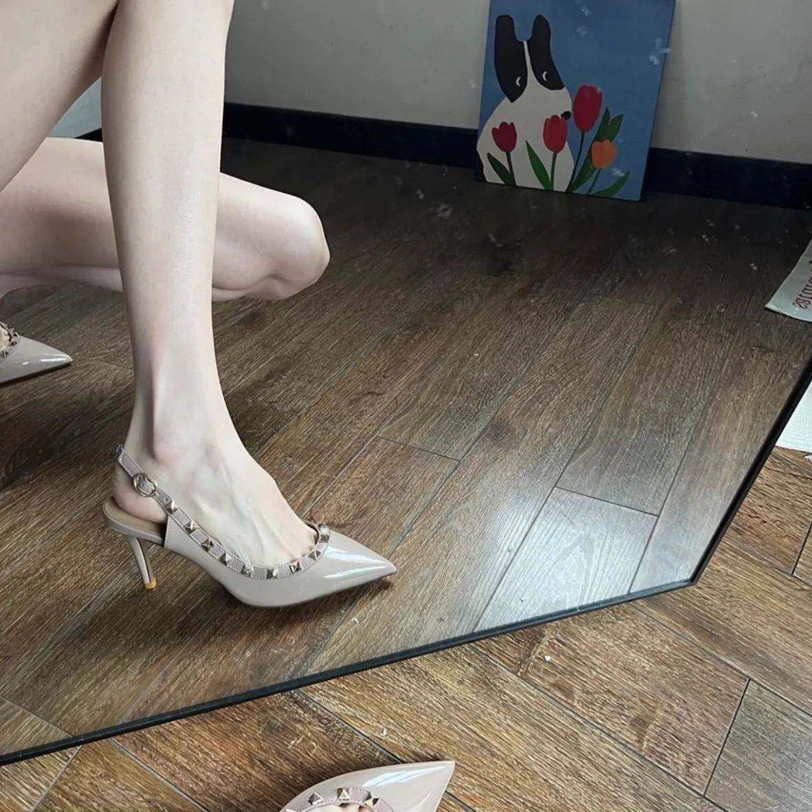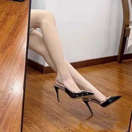 高跟鞋女斩男细跟不累脚铆钉凉鞋2024年夏新款尖头单鞋漆皮侧空鞋