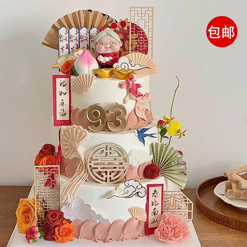 网红祝寿蛋糕装饰寿字亚克力插件中式爷爷奶奶寿桃生日甜品摆件