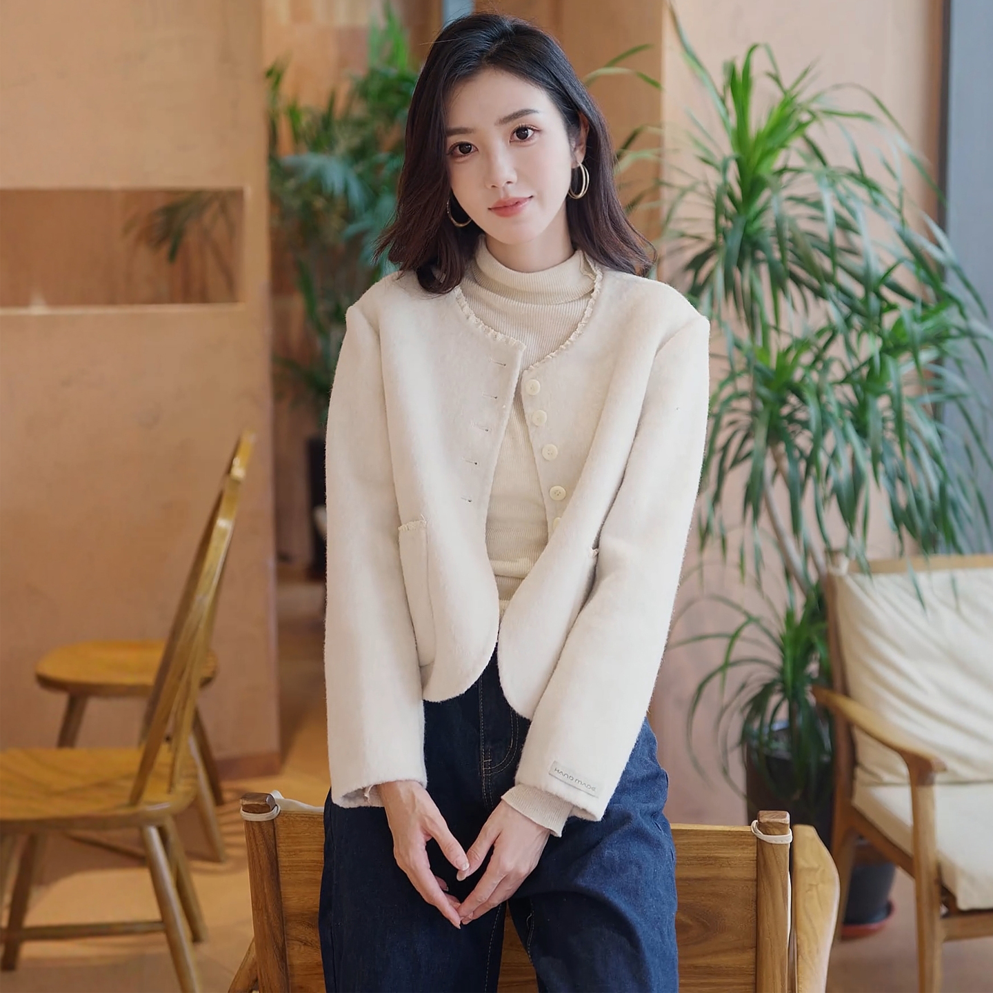 小香风花边领圆领双面羊毛呢外套