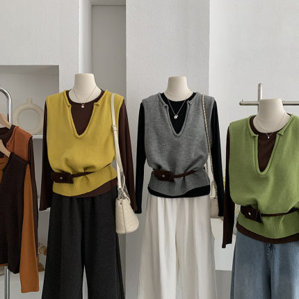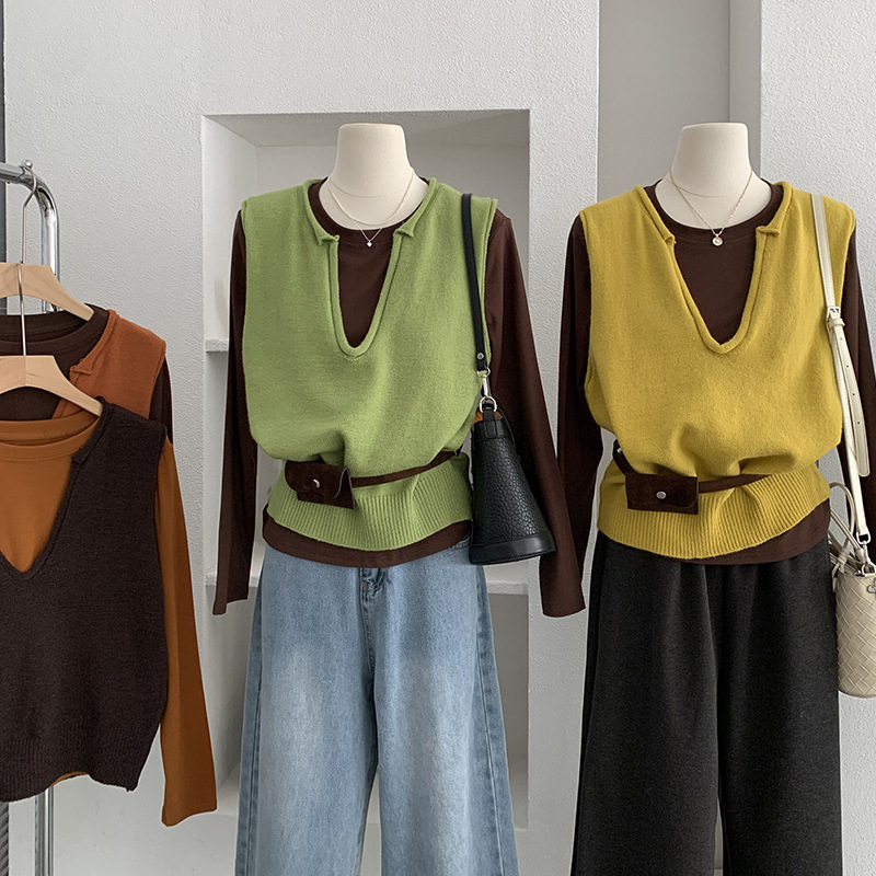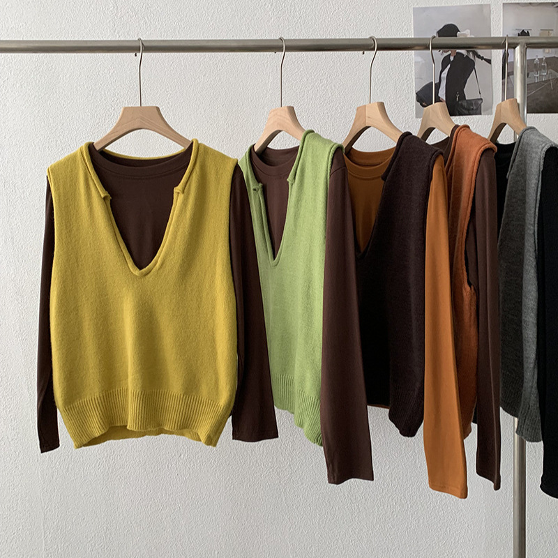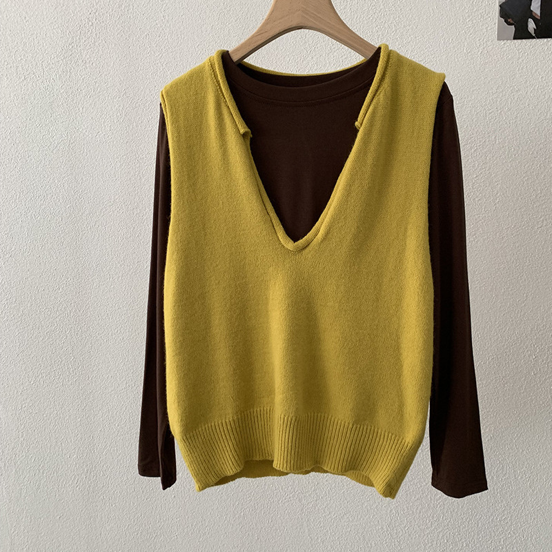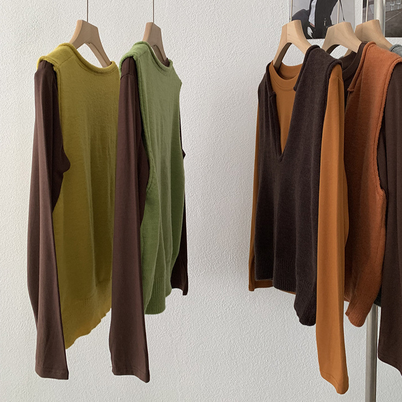 欧玛莱 圆领长袖纯色T恤打底衫叠搭V领无袖针织背心两件套女