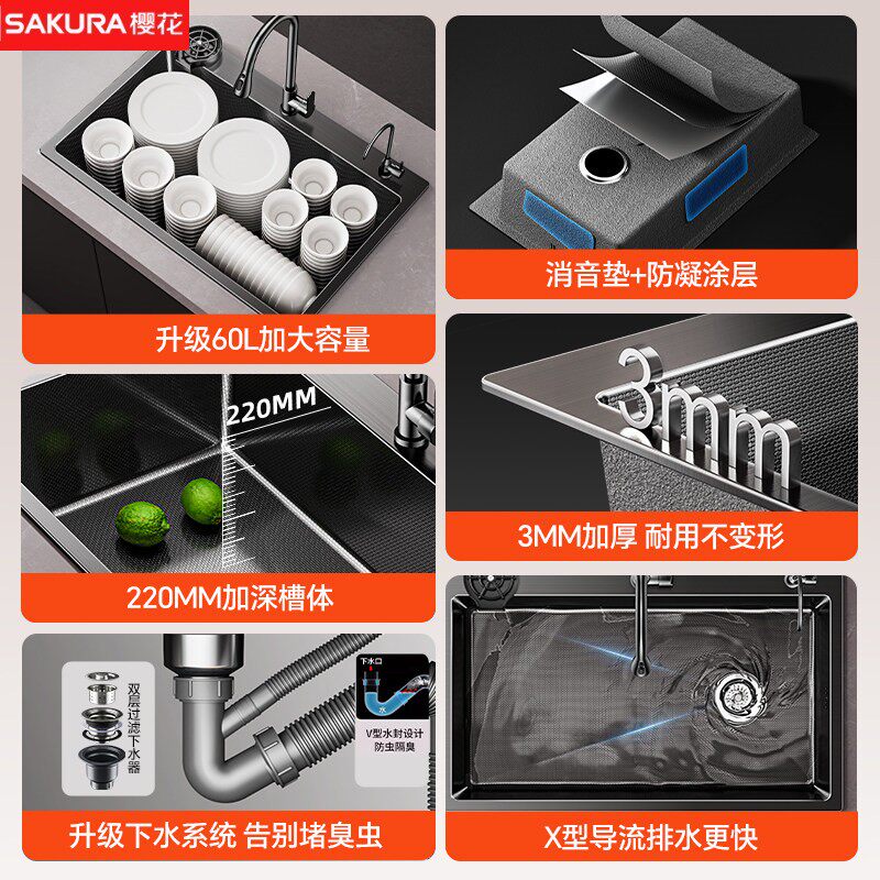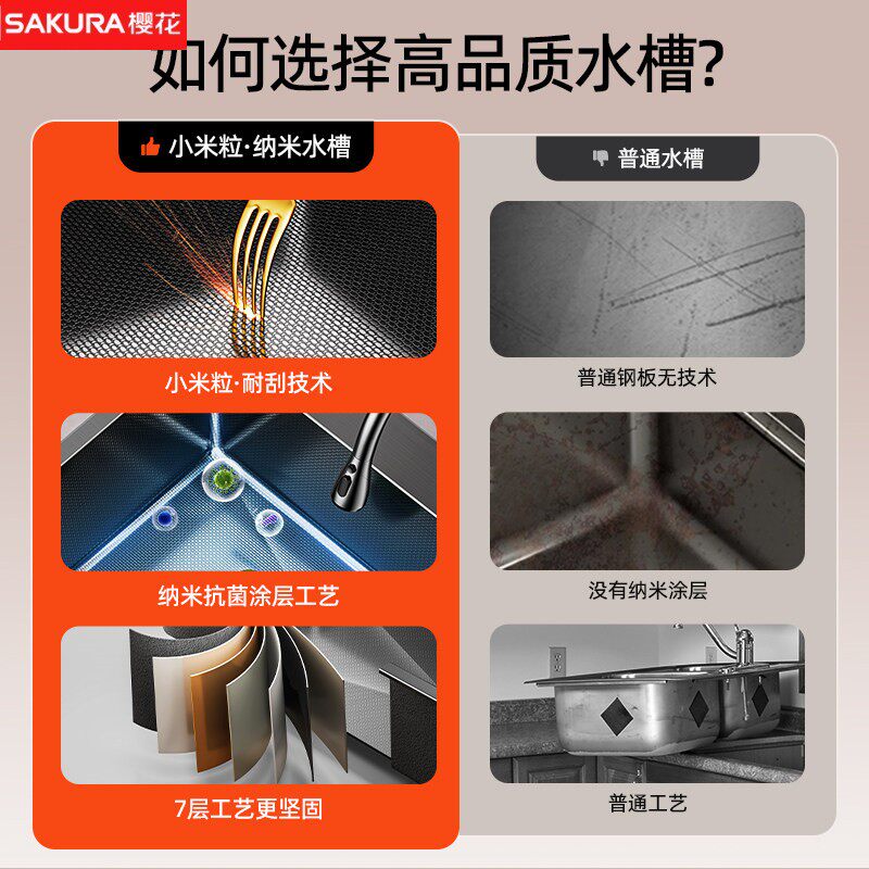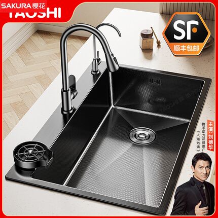 樱花厨房水槽大单槽洗菜盆不锈钢304洗碗槽加厚洗手池台下一体柜