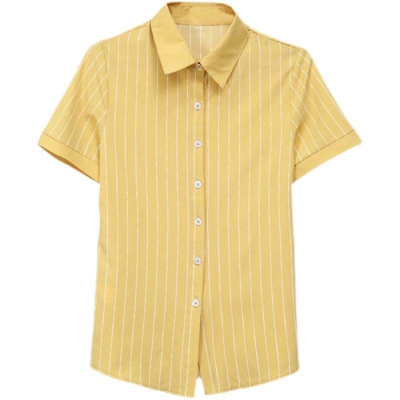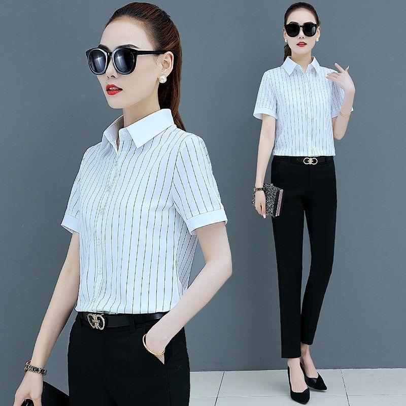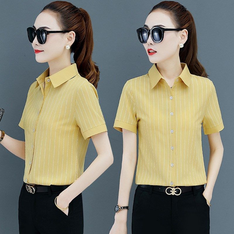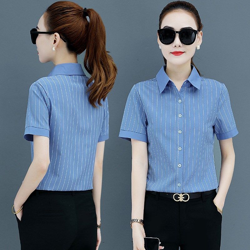2024春季新款女士条纹短袖衬衫宽松显瘦气质雪纺衫短袖职业装衬衣