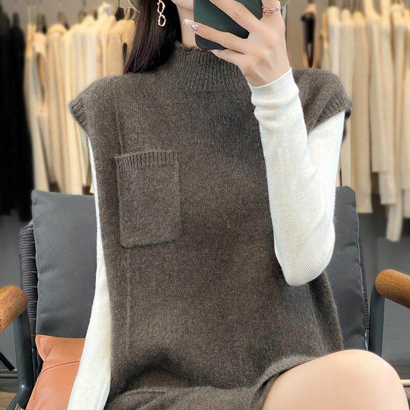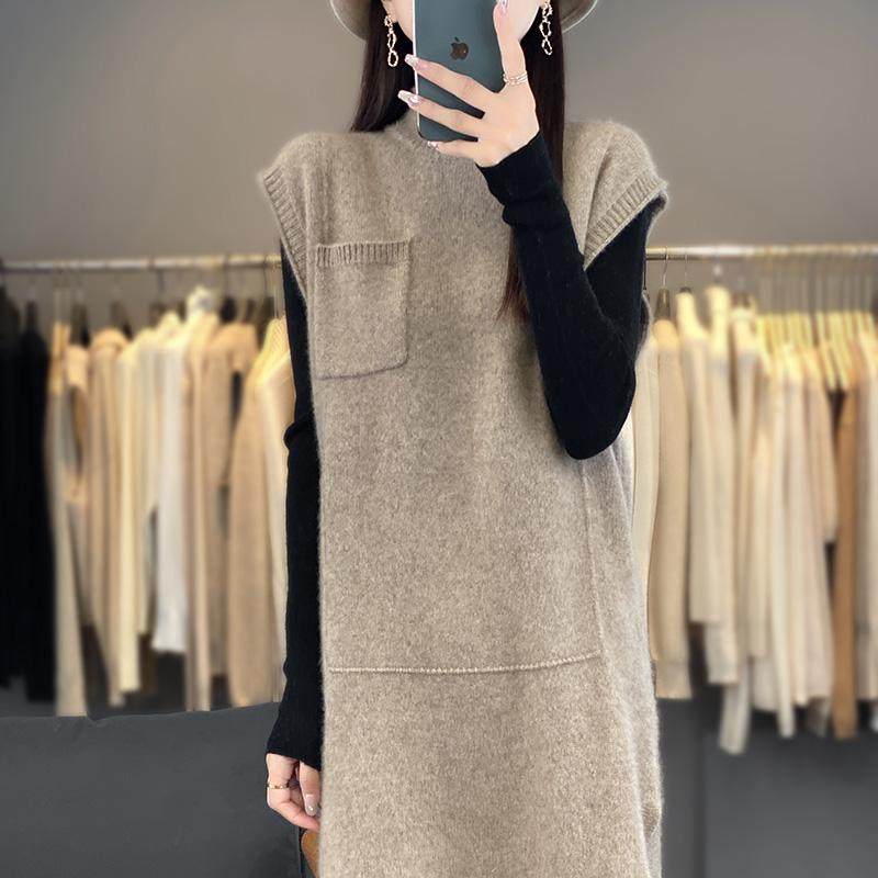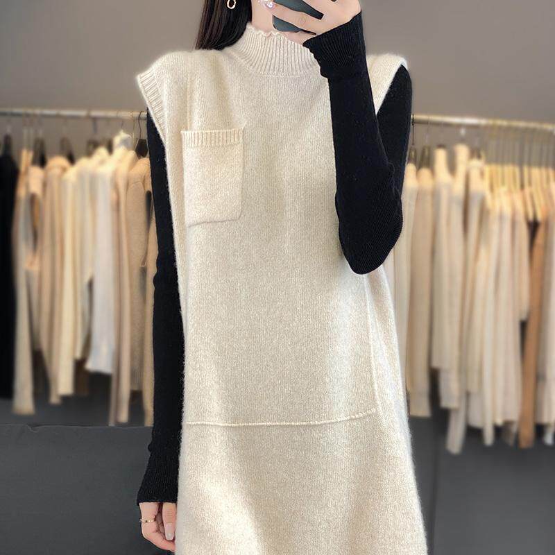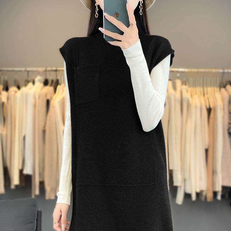 中长款100%纯羊毛衫马甲女半高领带兜毛衣背心长裙宽松羊绒衫坎肩