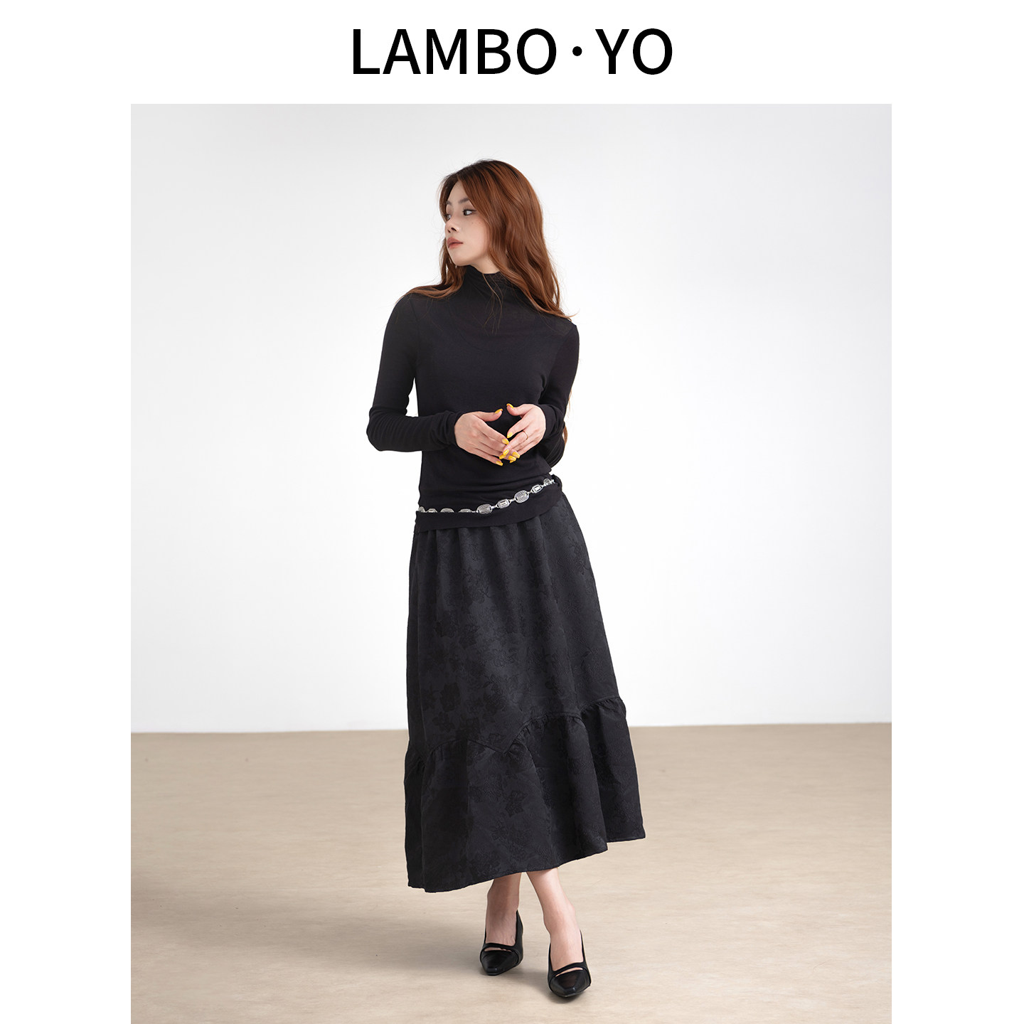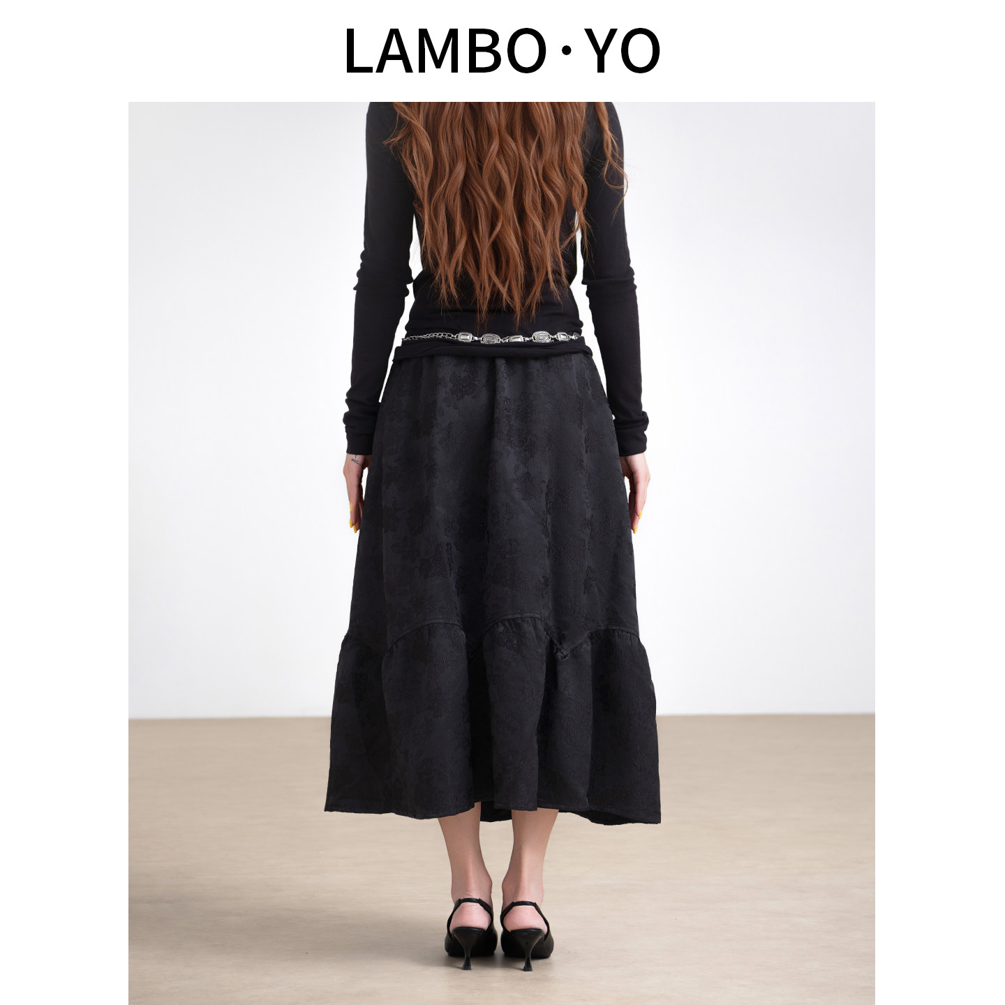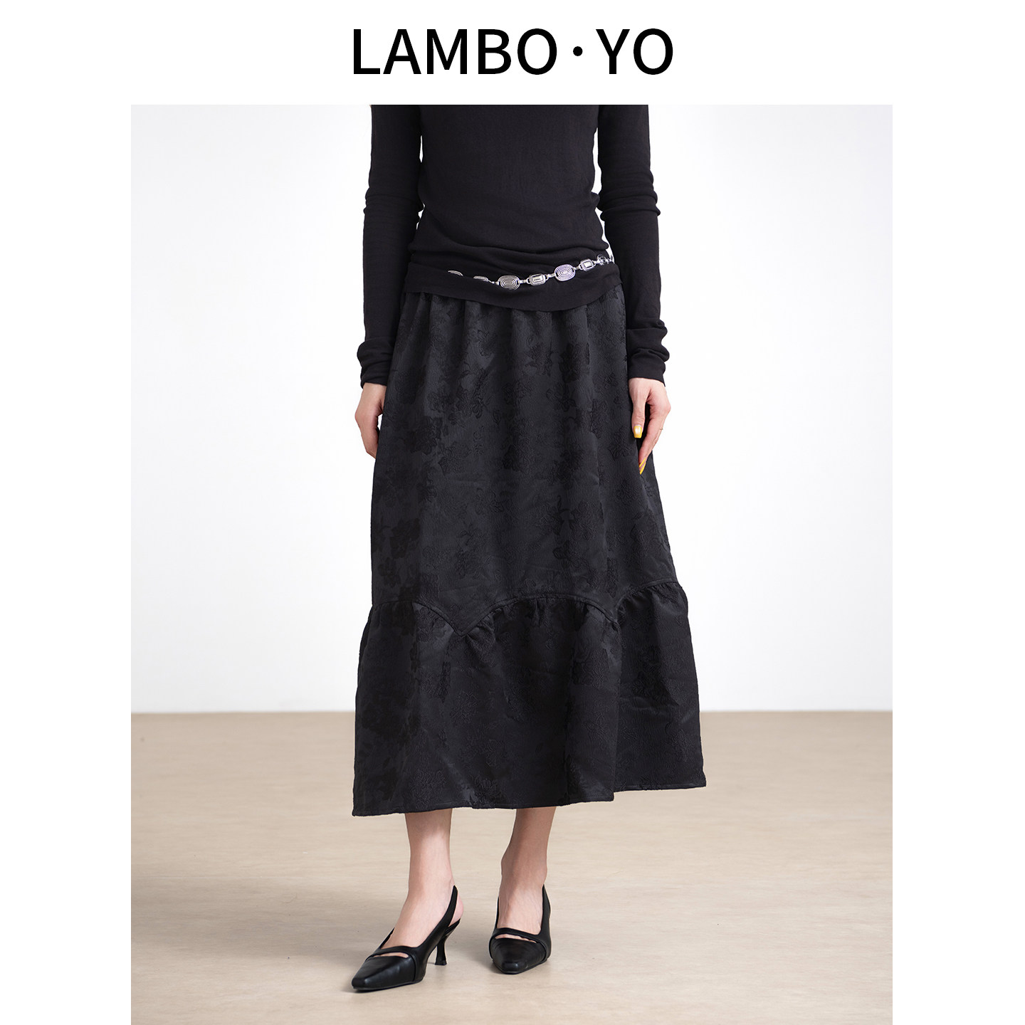 LAMBOYO2025秋季新款松紧腰立体提花半身裙高腰气质荷叶边裙女