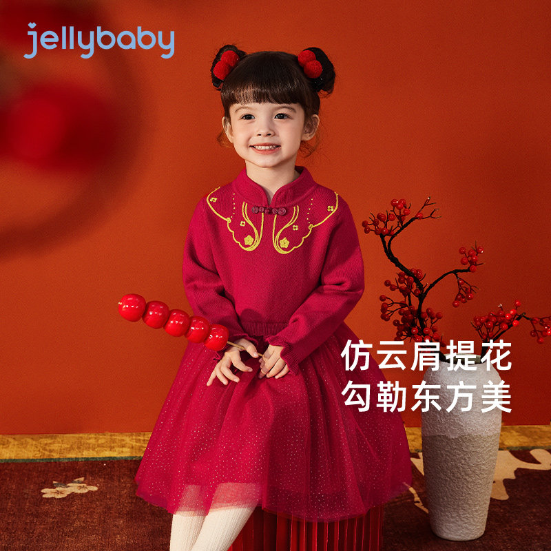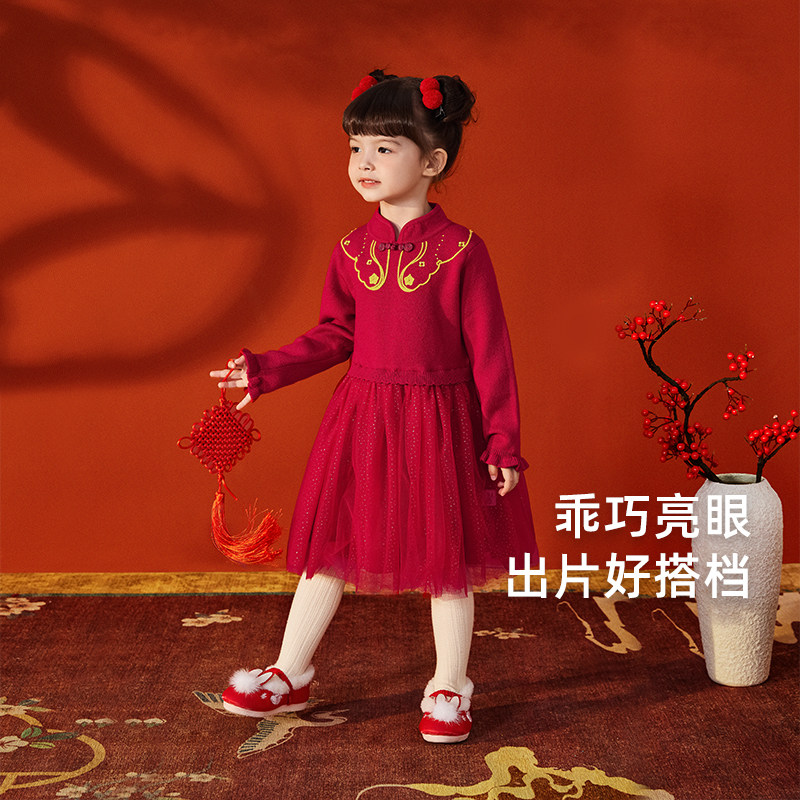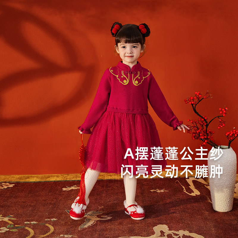 女童秋冬连衣裙宝宝冬季加绒纱裙小童生日宴中式礼服红色公主裙子