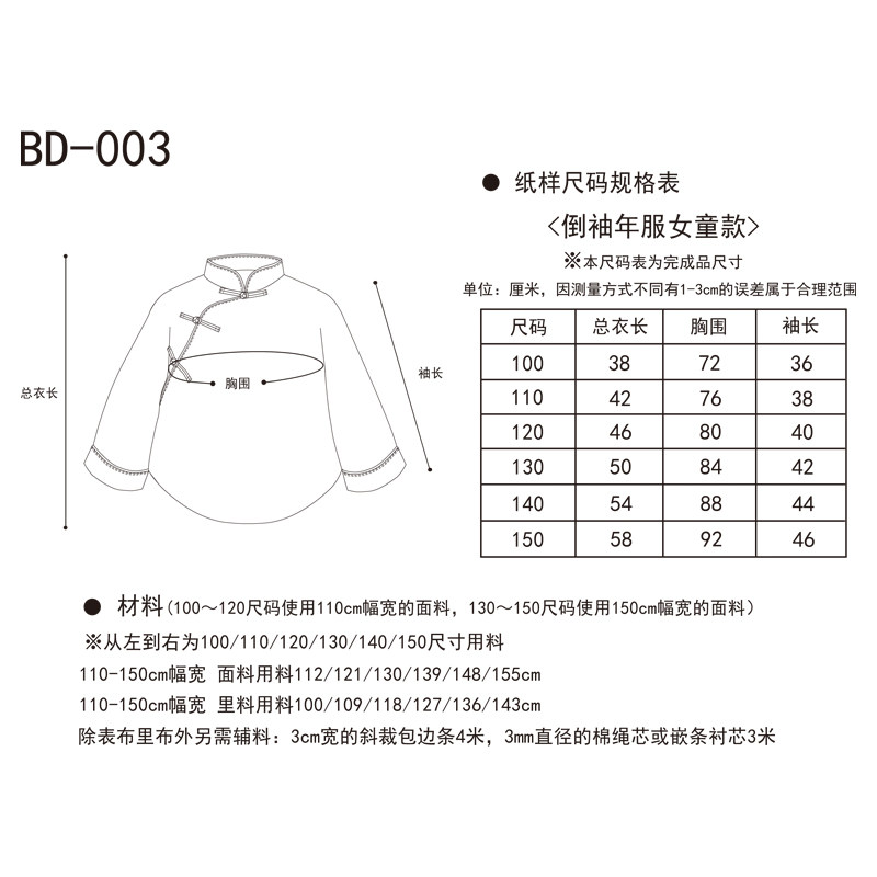 布懂时光自主打版图样女童款倒袖年服棉服手工制作1:1纸样BD-003