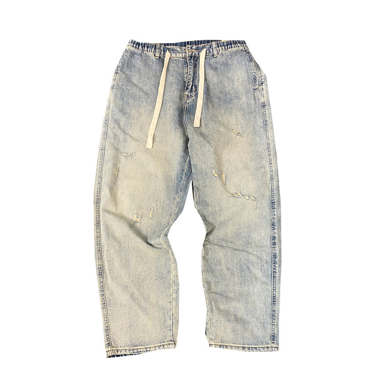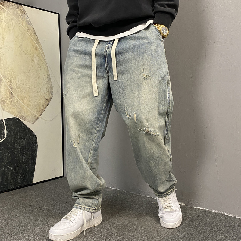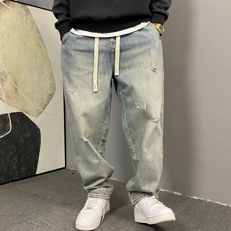 美式休闲痞帅水洗复古怀旧破洞牛仔裤男直筒宽松抽绳高街锥形裤子