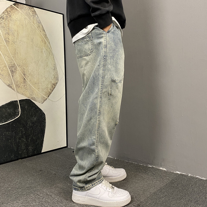 水洗复古破洞牛仔裤男直筒宽松