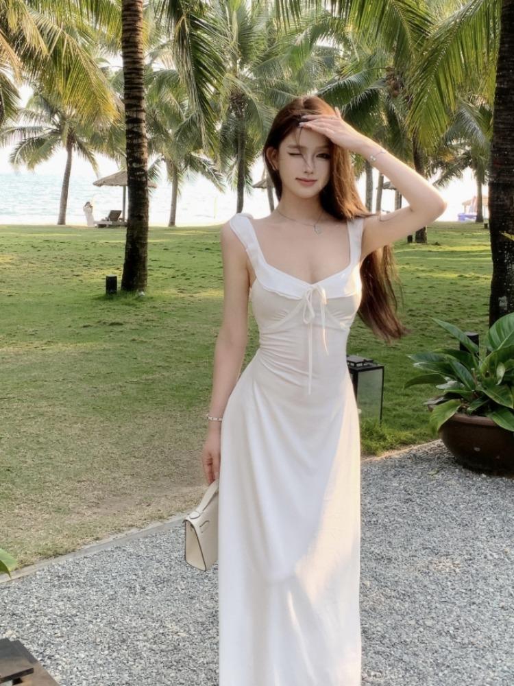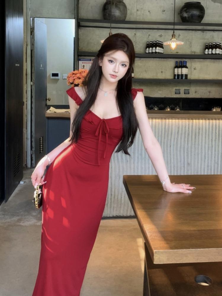 酒红色系带荷叶边吊带连衣裙女夏季纯欲风性感中长款收腰a字裙子