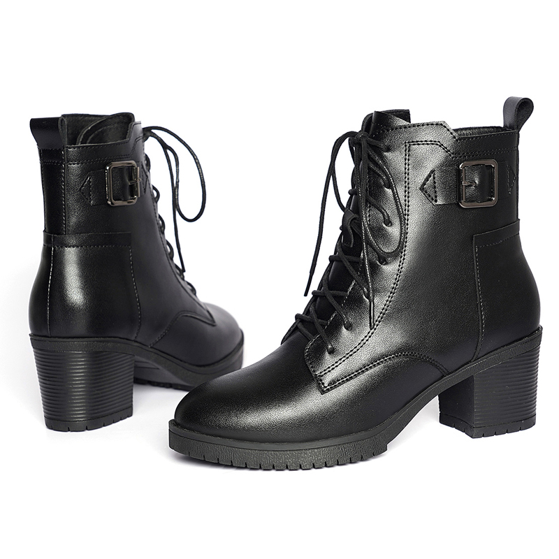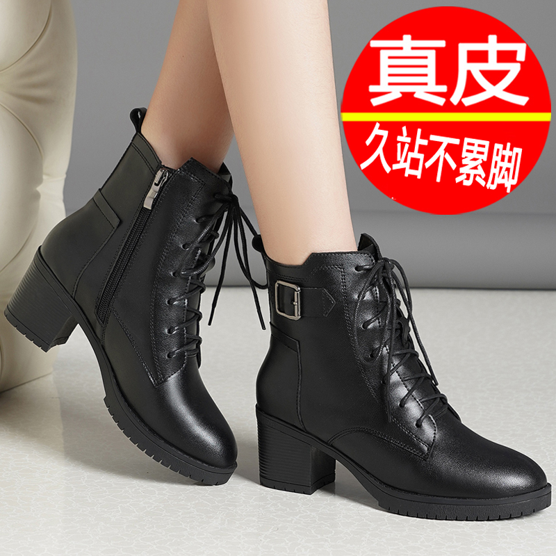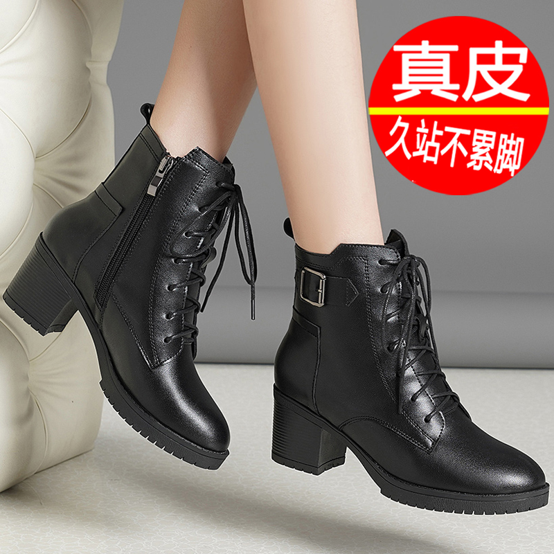 2025秋冬真皮马丁靴女粗跟软底系带加绒女靴子厚底短靴女高跟单靴
