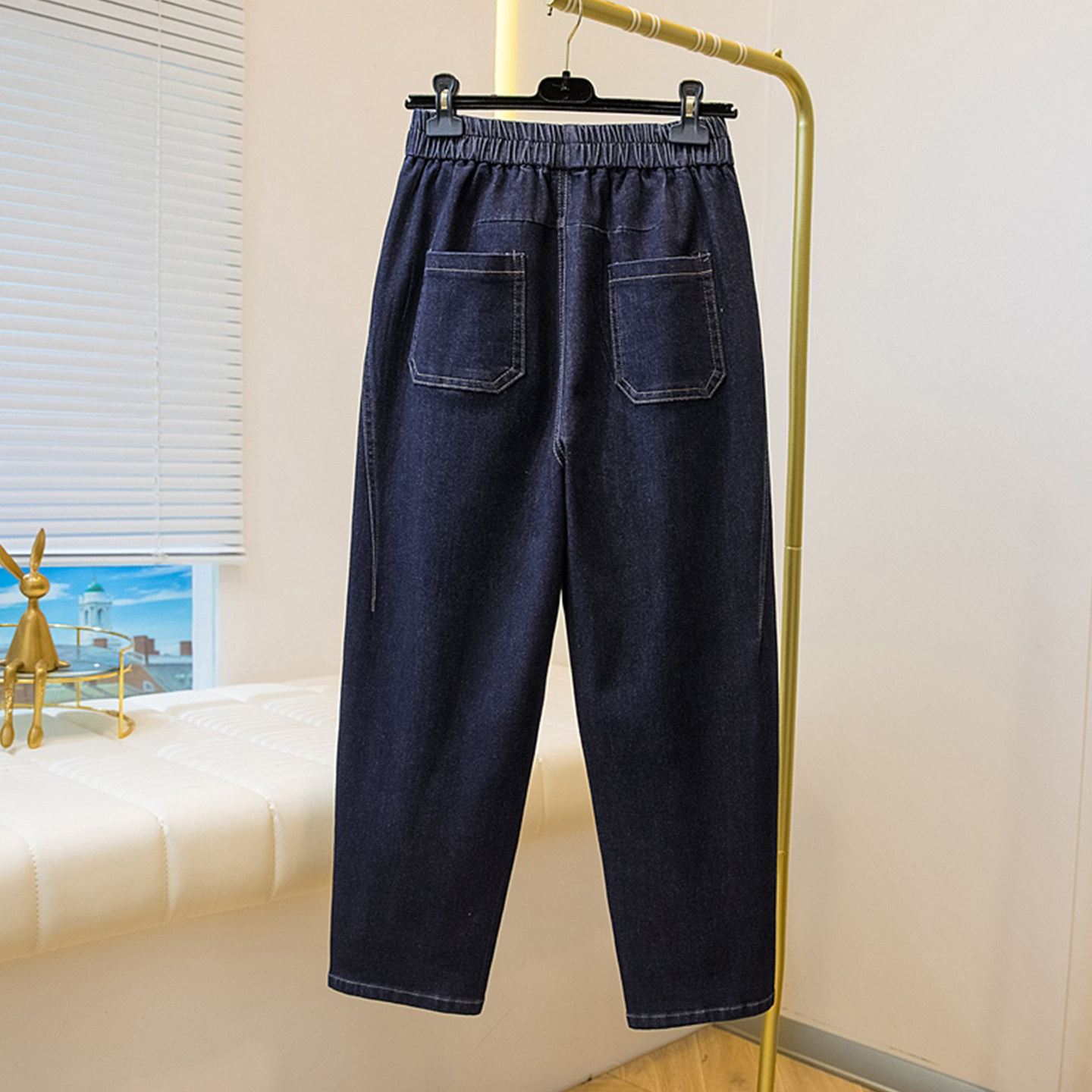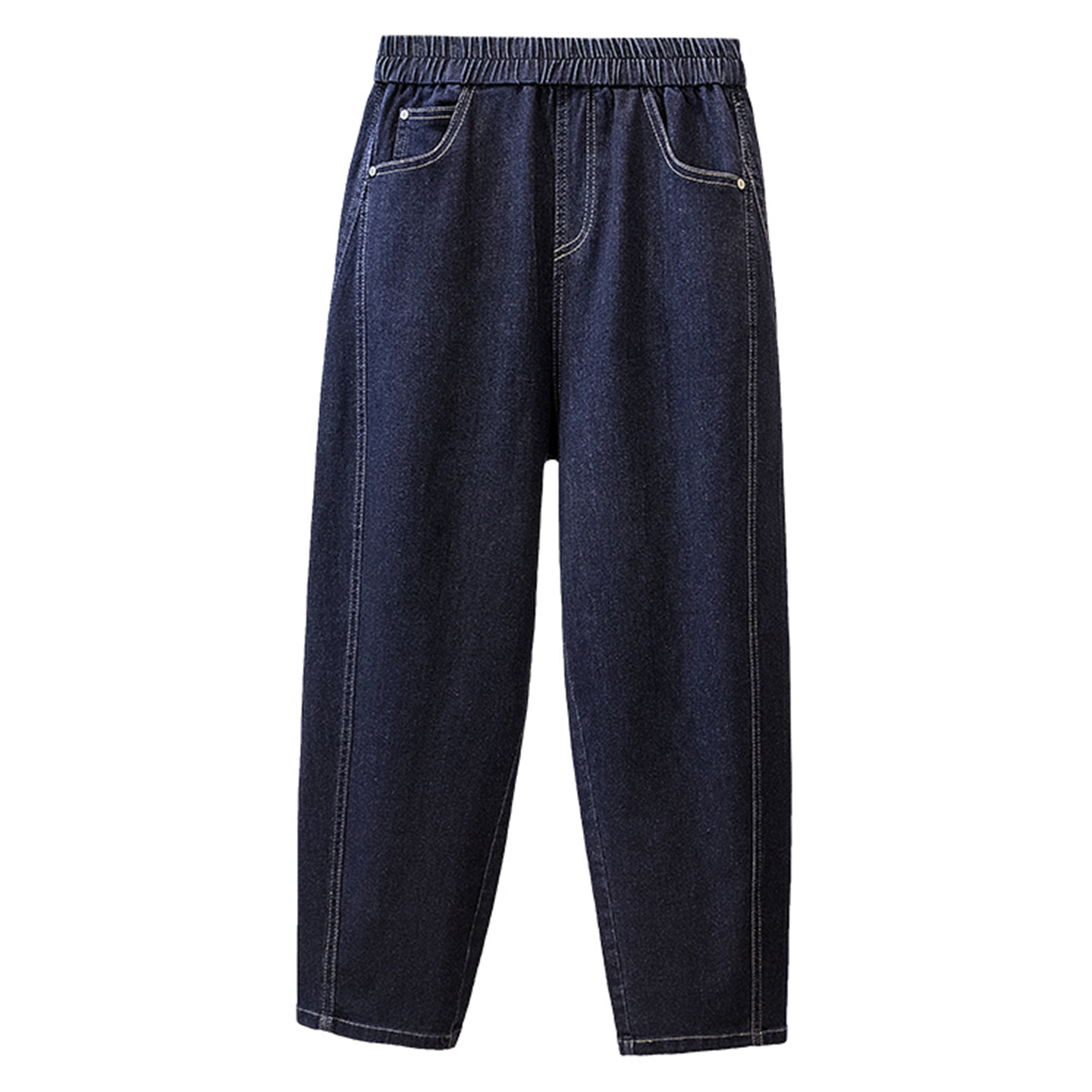 明线设计松紧腰牛仔裤胖mm大码直筒遮胯哈伦裤深蓝色宽松显瘦长裤