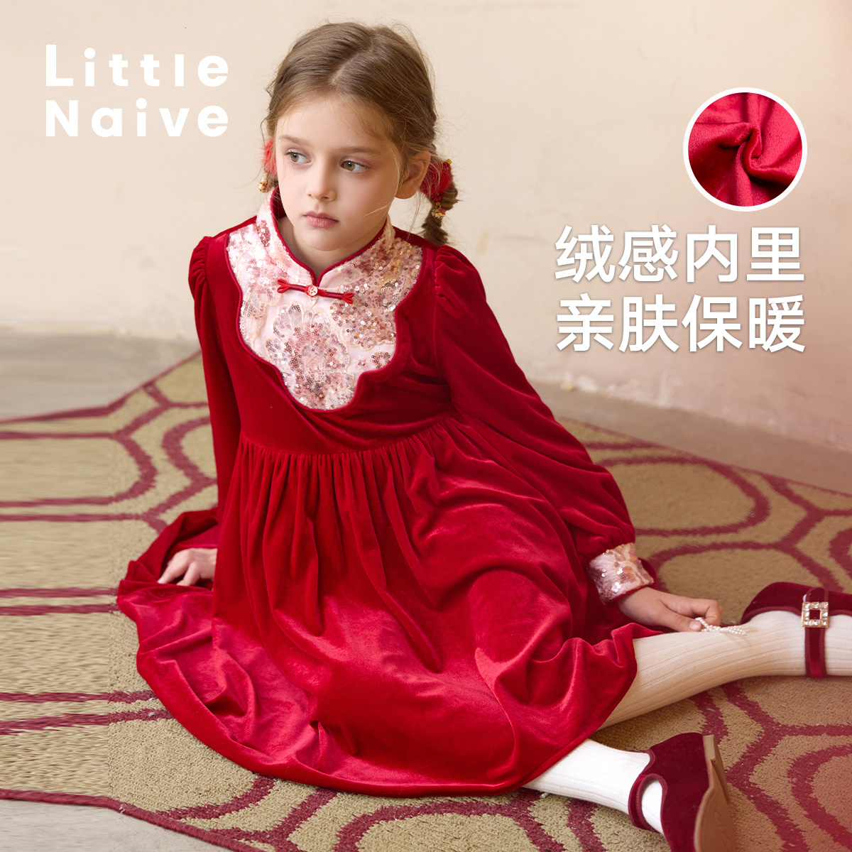 LittleNaive女童中式连衣裙冬款加绒红色裙子儿童新年珠片丝绒裙