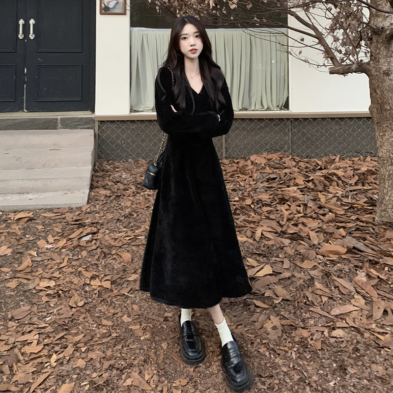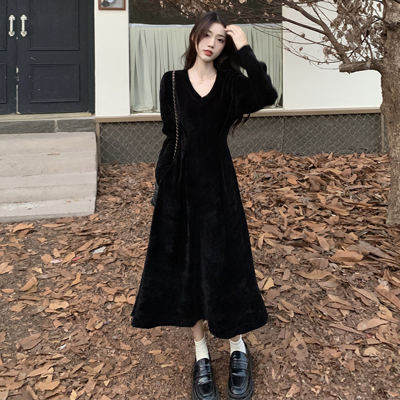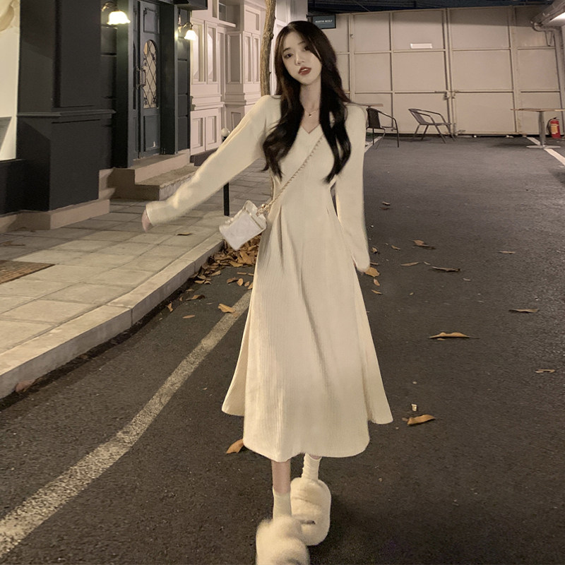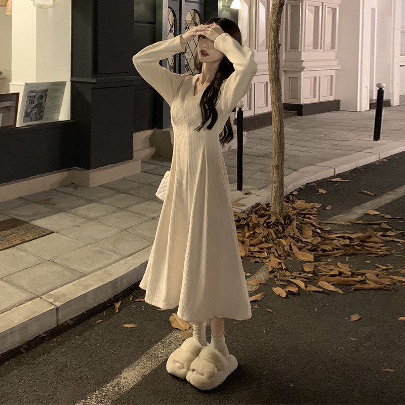 气质温柔风收腰长袖连衣裙女秋冬装2025新款配大衣的内搭打底裙子