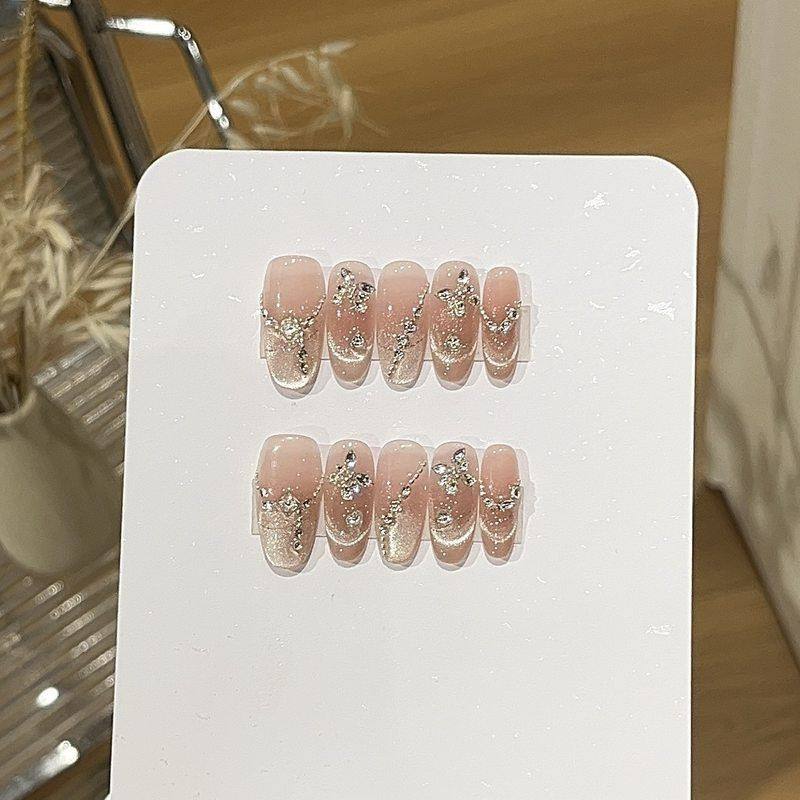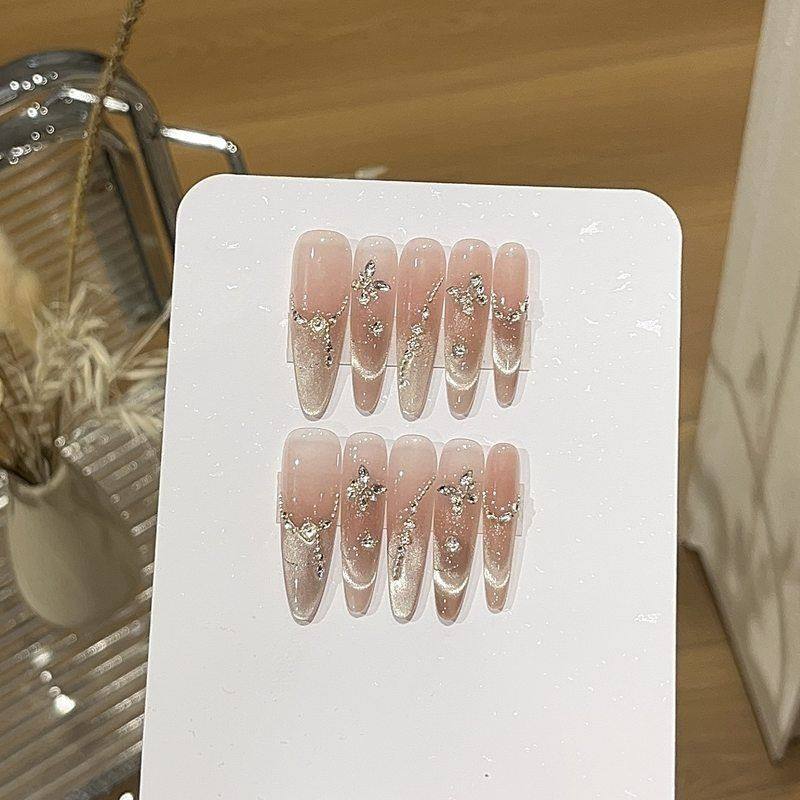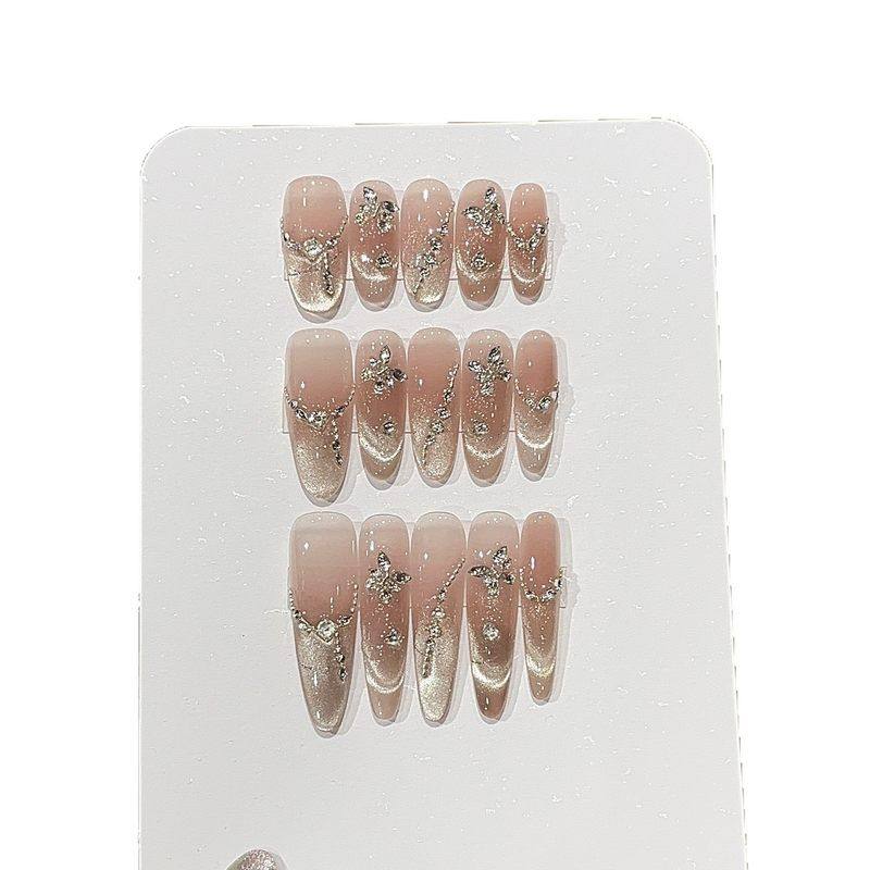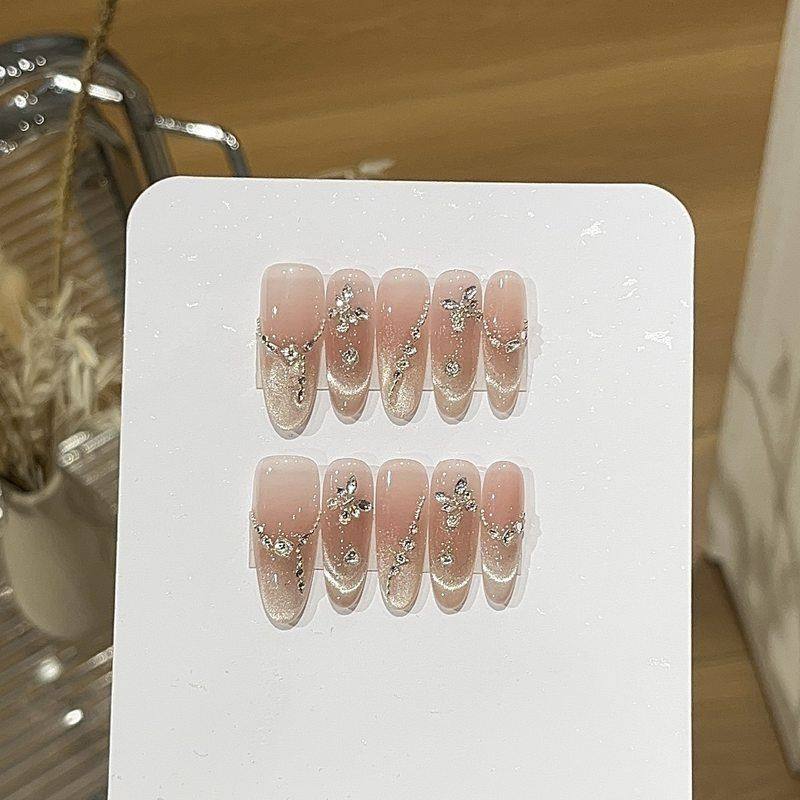 轻奢气质蜜柚纯欲风爆闪奶杏色微笑法式猫眼设计感链条贴钻穿戴甲