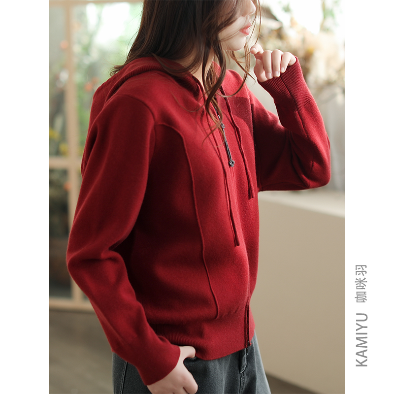 咖咪羽毛衣女秋冬新款红色女士原创休闲文艺针织慵懒百搭连帽上衣