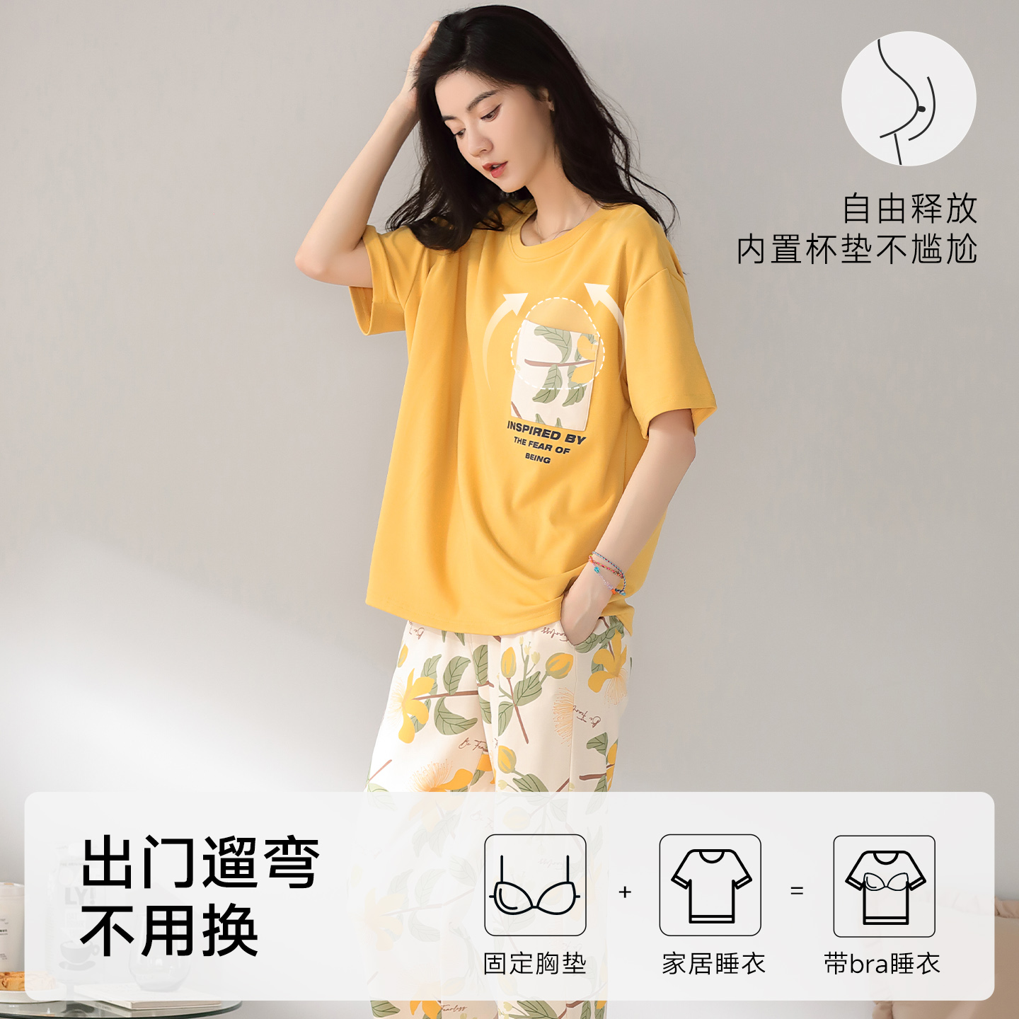 猫人纯棉睡衣女夏天薄款带胸垫短袖七分裤宽松大码外穿棉绸家居服