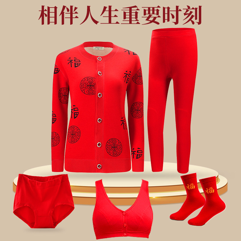 中老年人本命年红色加厚加绒套装女妈妈老人爸爸保暖内衣男蛇年冬