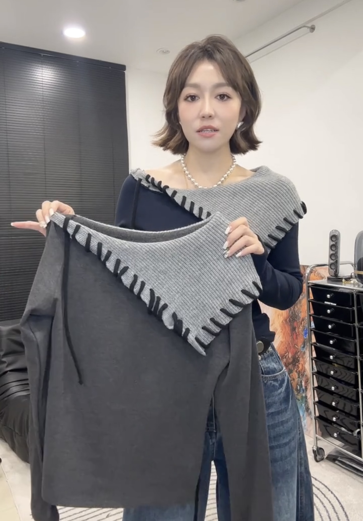 欧洲站2025秋季新款拼接不等式针织领t恤女时尚洋气百搭长袖上衣