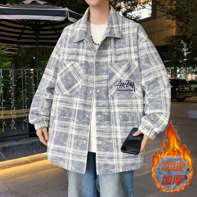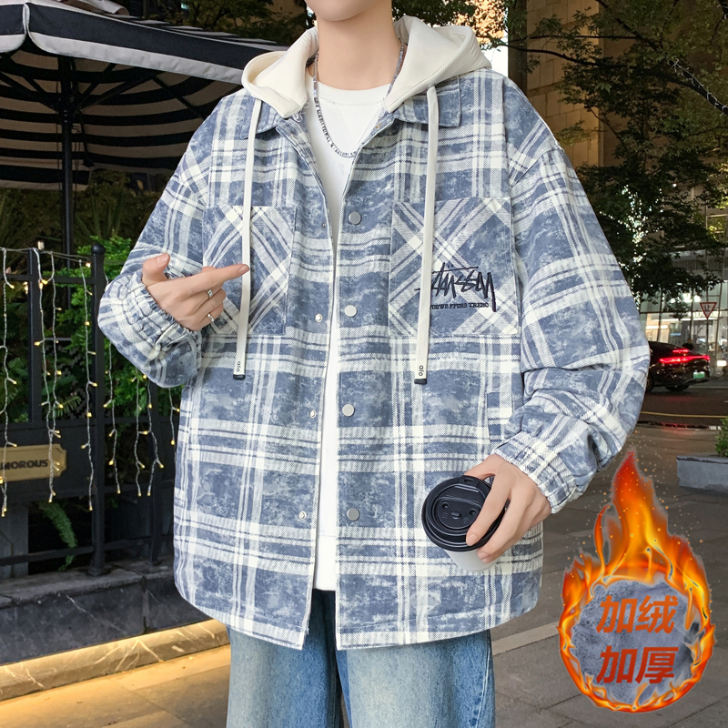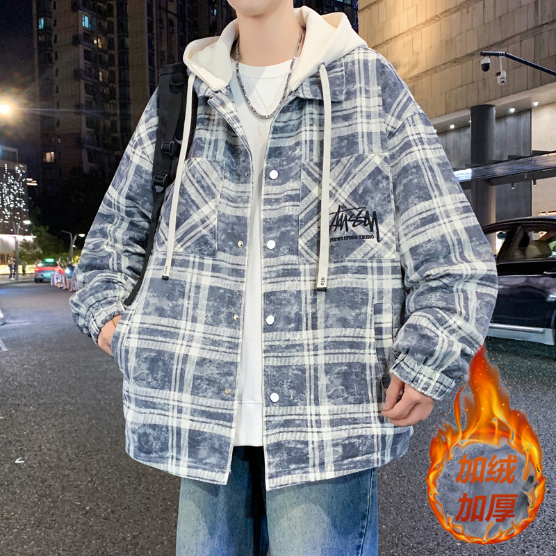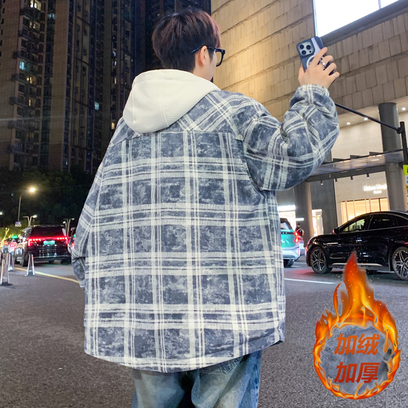 设计感格子外套男款冬季加绒可脱卸帽夹克男生青少年保暖棉衣以純