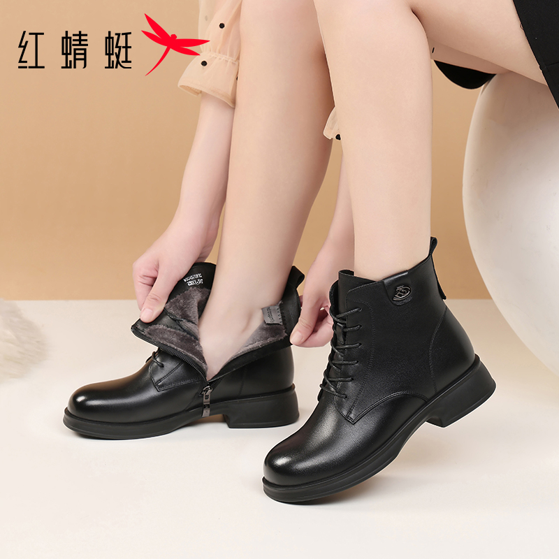 红蜻蜓马丁靴女款冬季新款女鞋厚底粗跟系带短筒靴加绒保暖女棉鞋