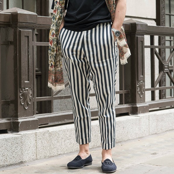 欧美走秀款垂感亚麻男士休闲九分裤小脚夏季薄款条纹显瘦哈伦裤男