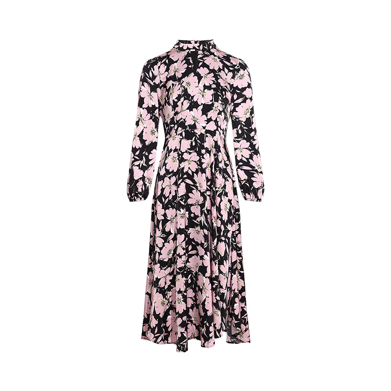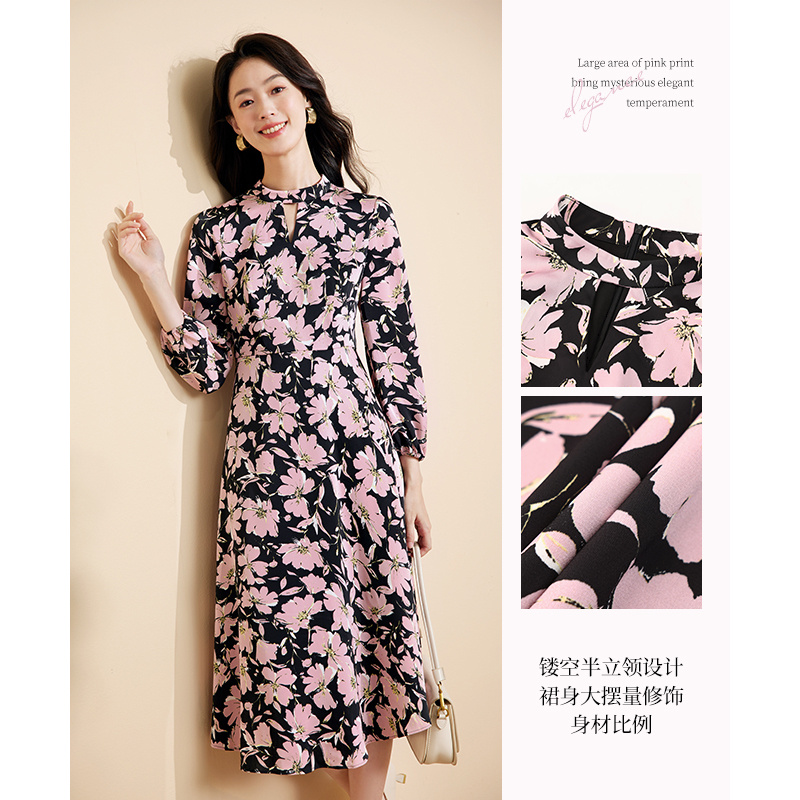 黛玛诗秋新款显瘦花裙子优雅气质立领长袖浪漫印花连衣裙女秋季