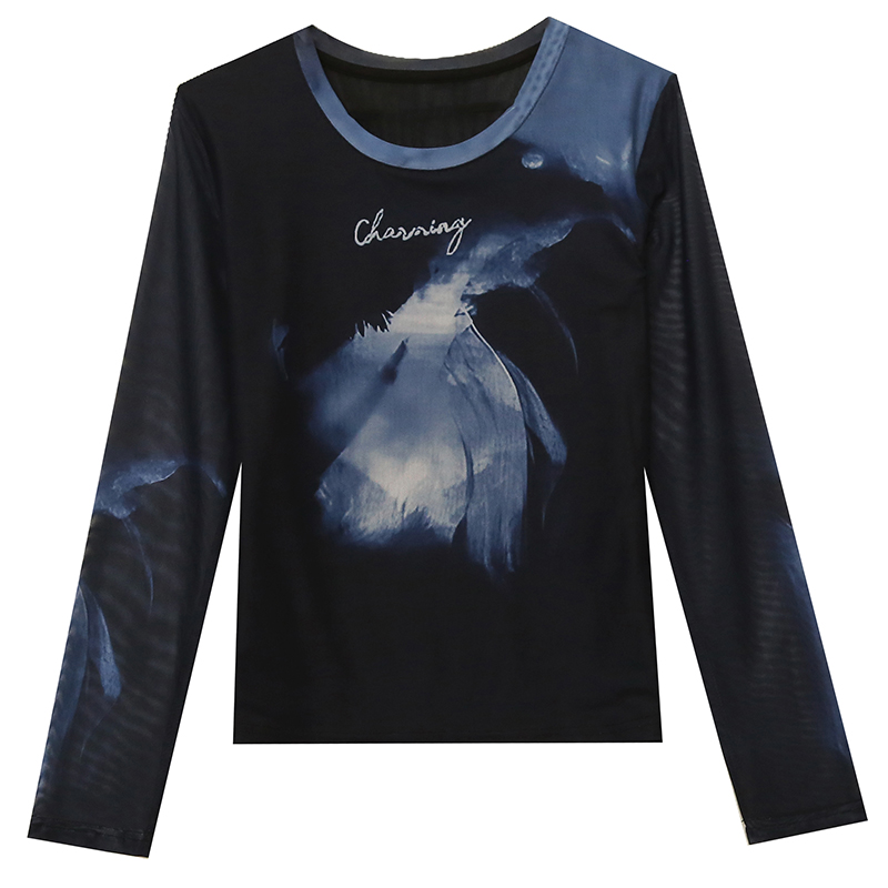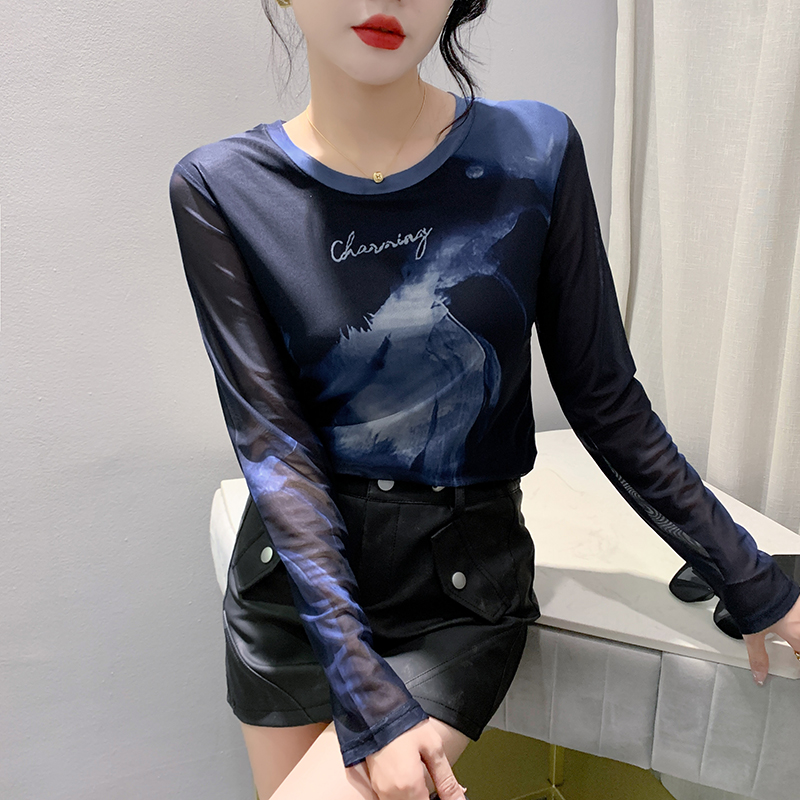 网纱打底衫女秋冬欧货时尚印花圆领上衣洋气修身显瘦长袖T恤小衫