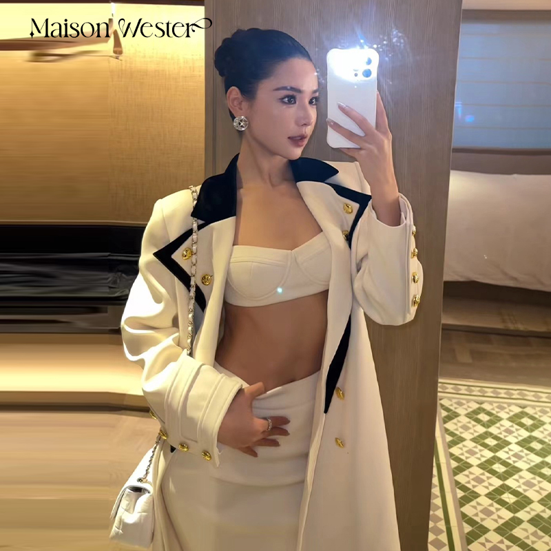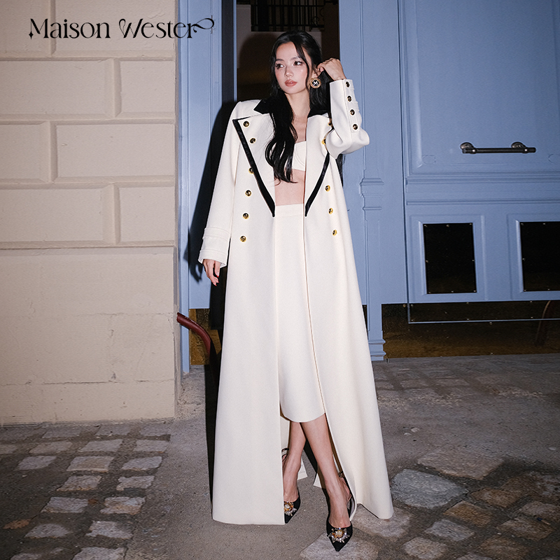 Maison Wester冬季女士米白拼黑丝绒领长款金扣大衣外套风衣上衣