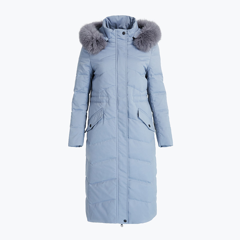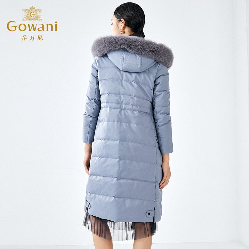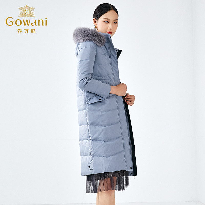 乔万尼羽绒服女商场新款清新雾霾蓝修身收腰狐狸毛领过膝长款韩版