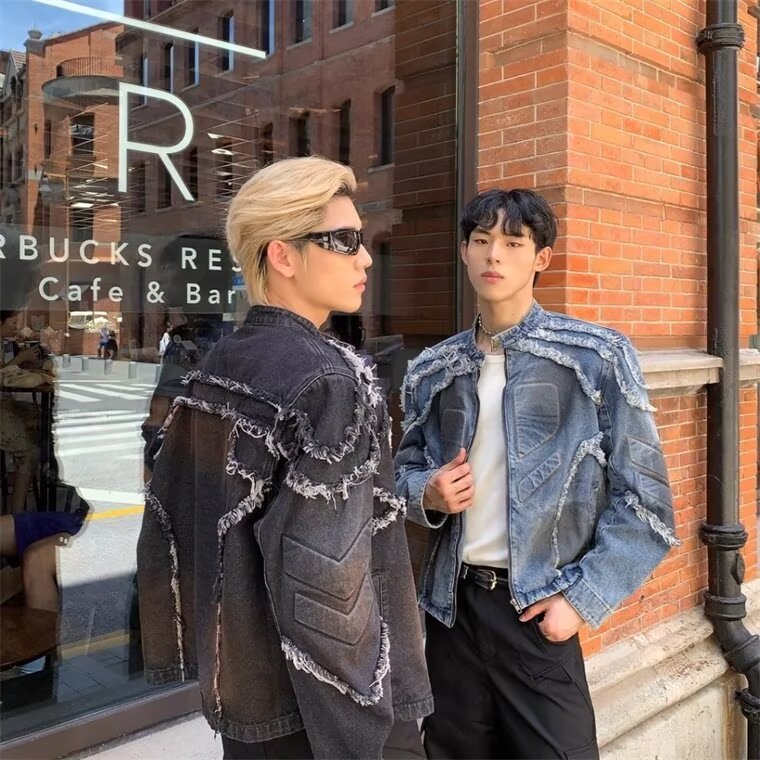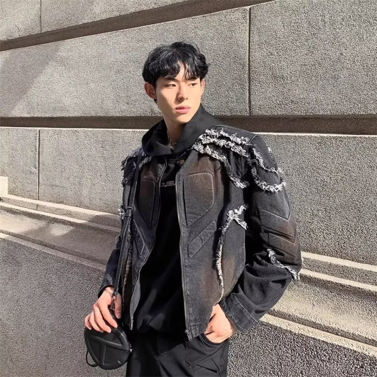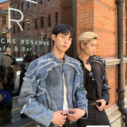 春秋美式复古旧凹凸浮雕垫肩牛仔衣夹克男生毛边水洗做脏染外套男