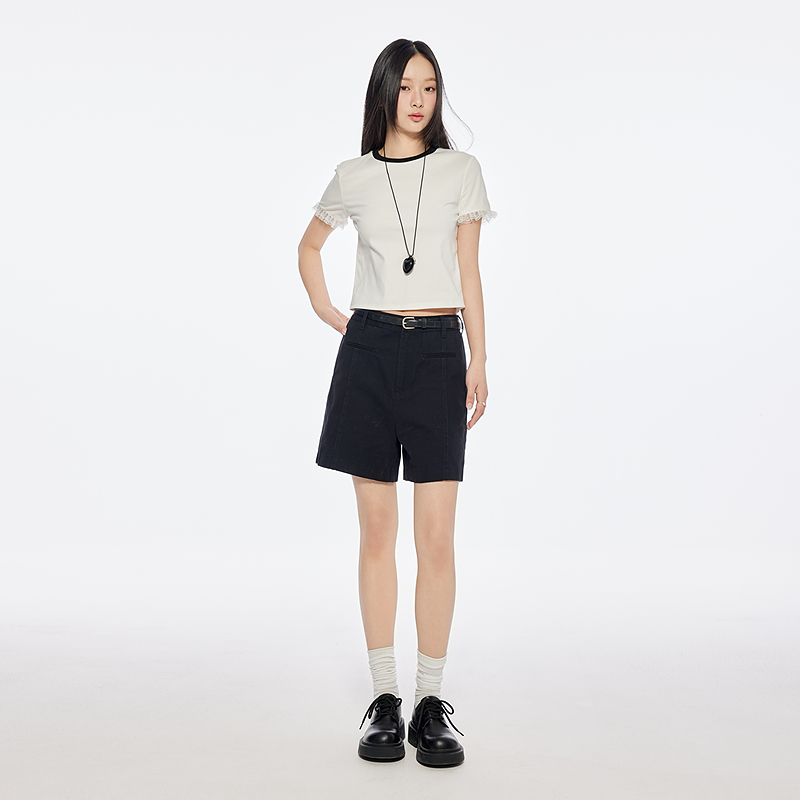 A21女装拼接荷叶袖短款T恤撞色圆领修身显瘦上衣简约小衫