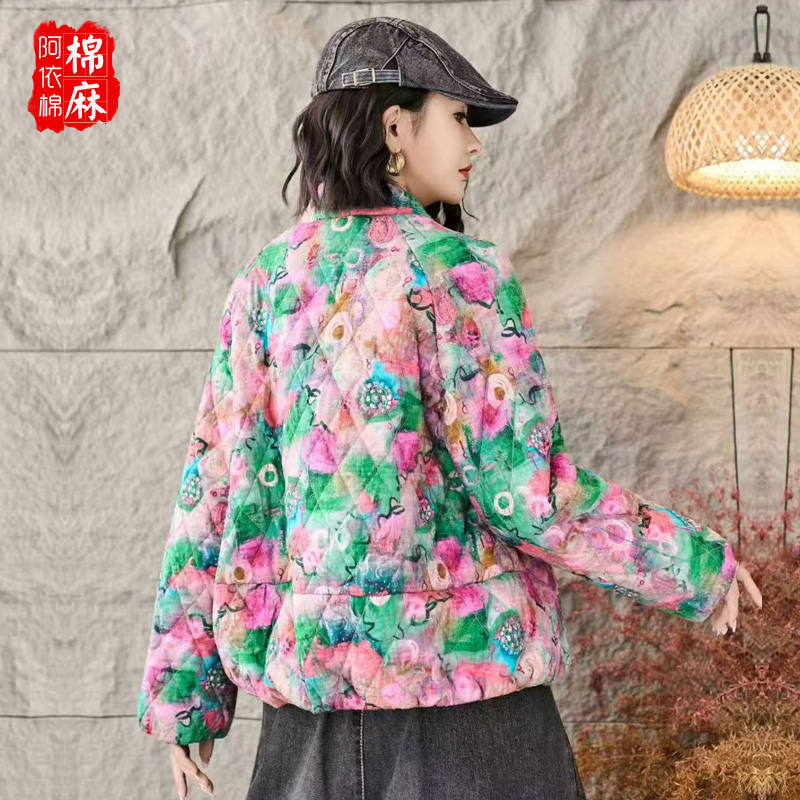 秋冬棉麻印花棉衣外套女宽松显瘦百搭气质中式棉布短款棉袄上衣女