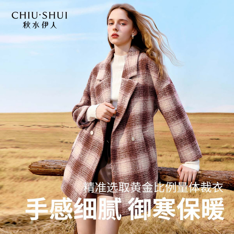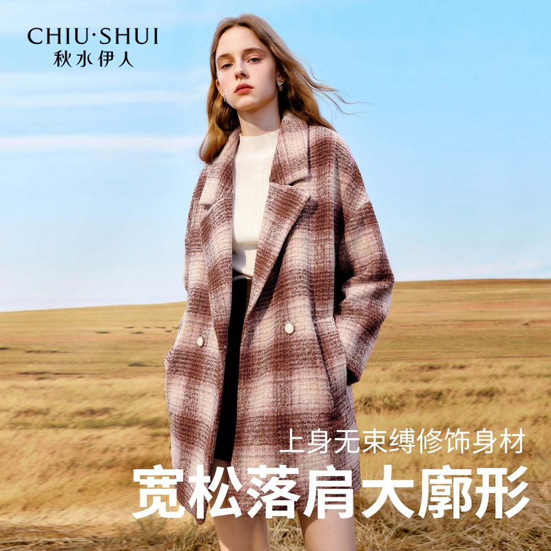 秋水伊人复古格纹宽松羊毛大衣2023年冬季新款女中长款毛呢厚外套