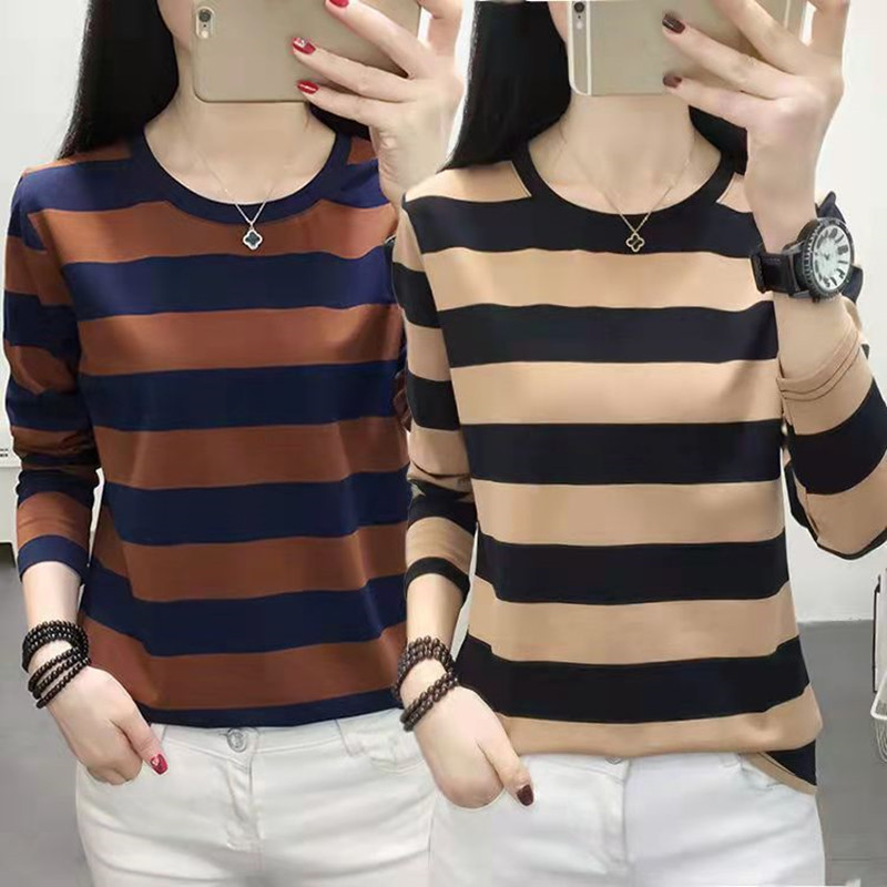 2023春装新款上衣女装修身显瘦条纹Y领长袖t恤女打底衫学生秋衣