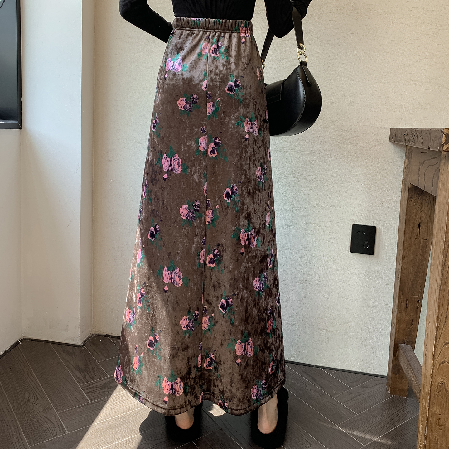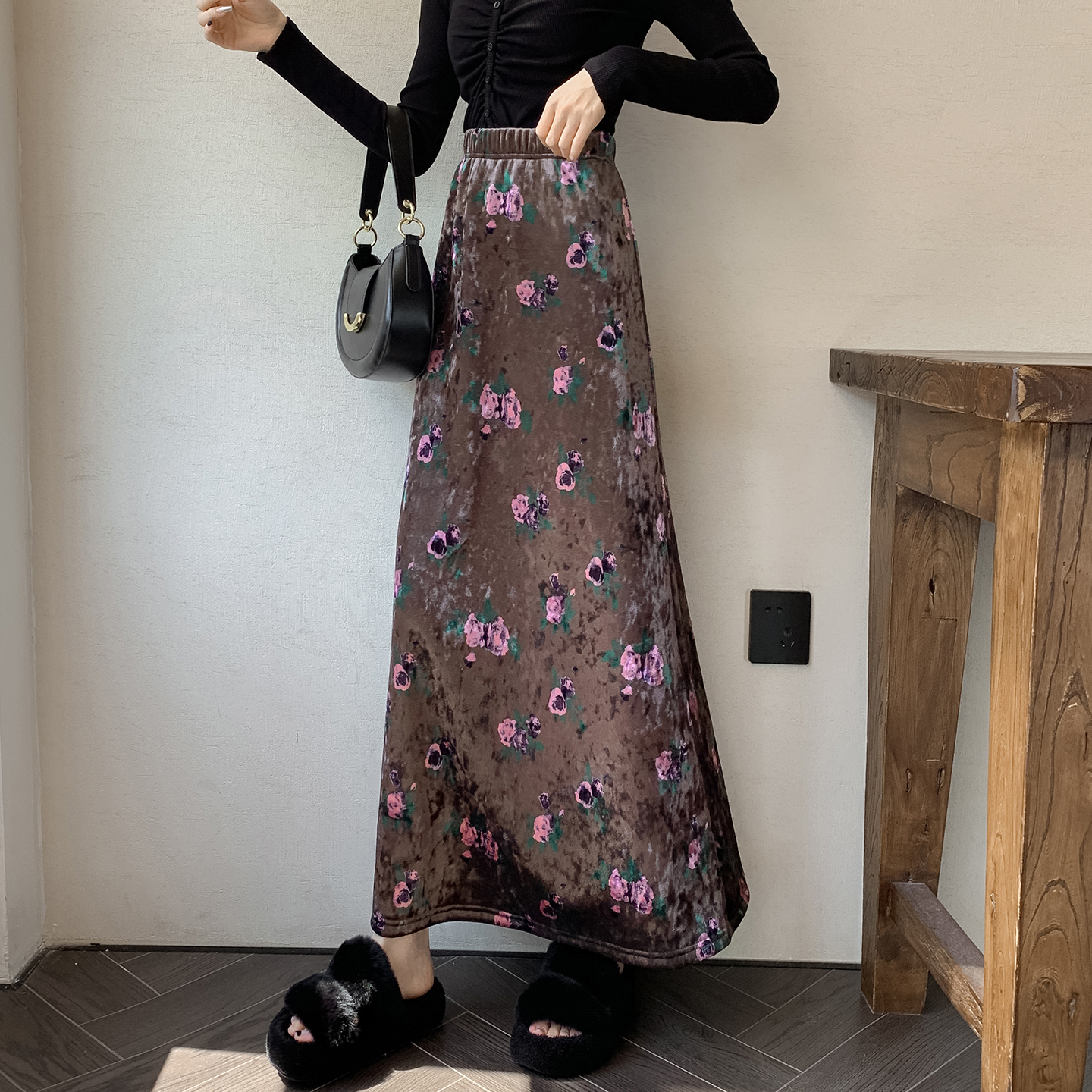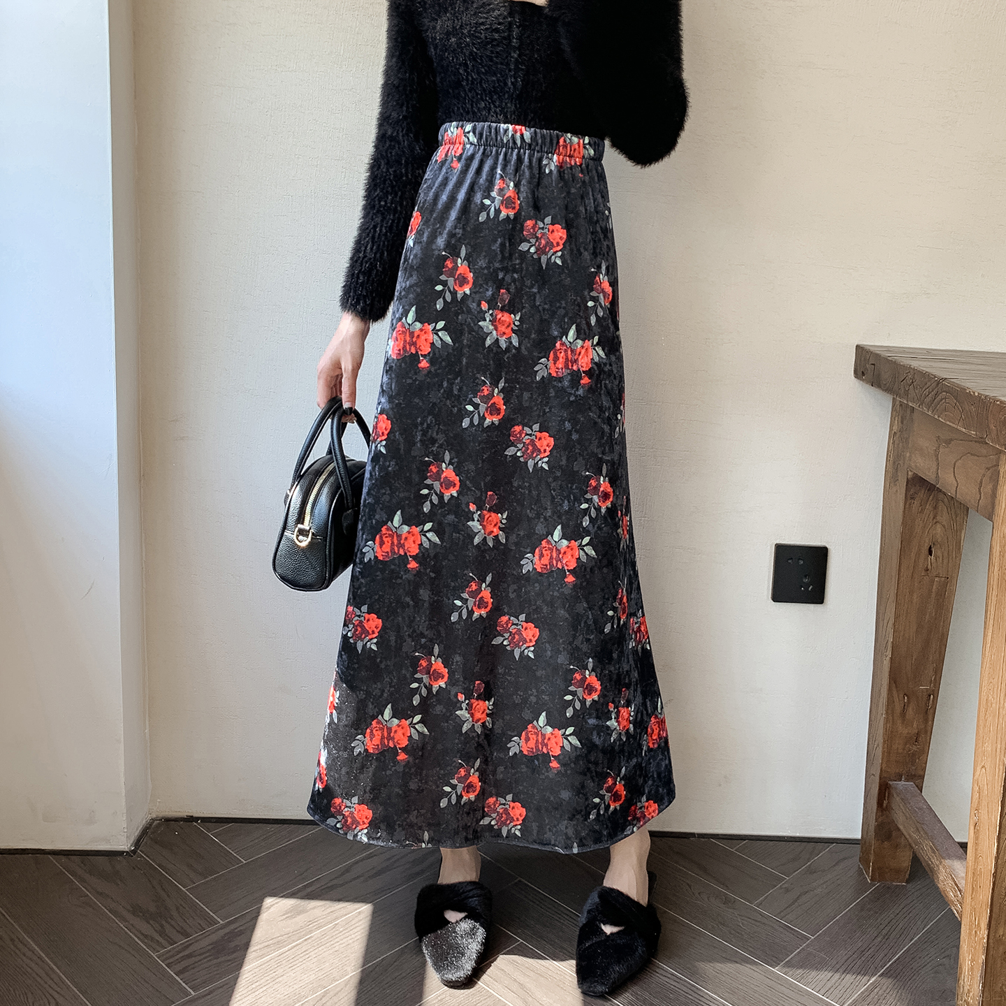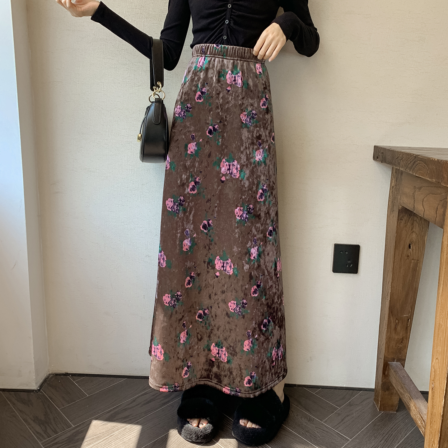 加绒加厚金丝绒碎花半身裙女2025秋冬高腰显瘦垂感鱼尾包臀长裙子