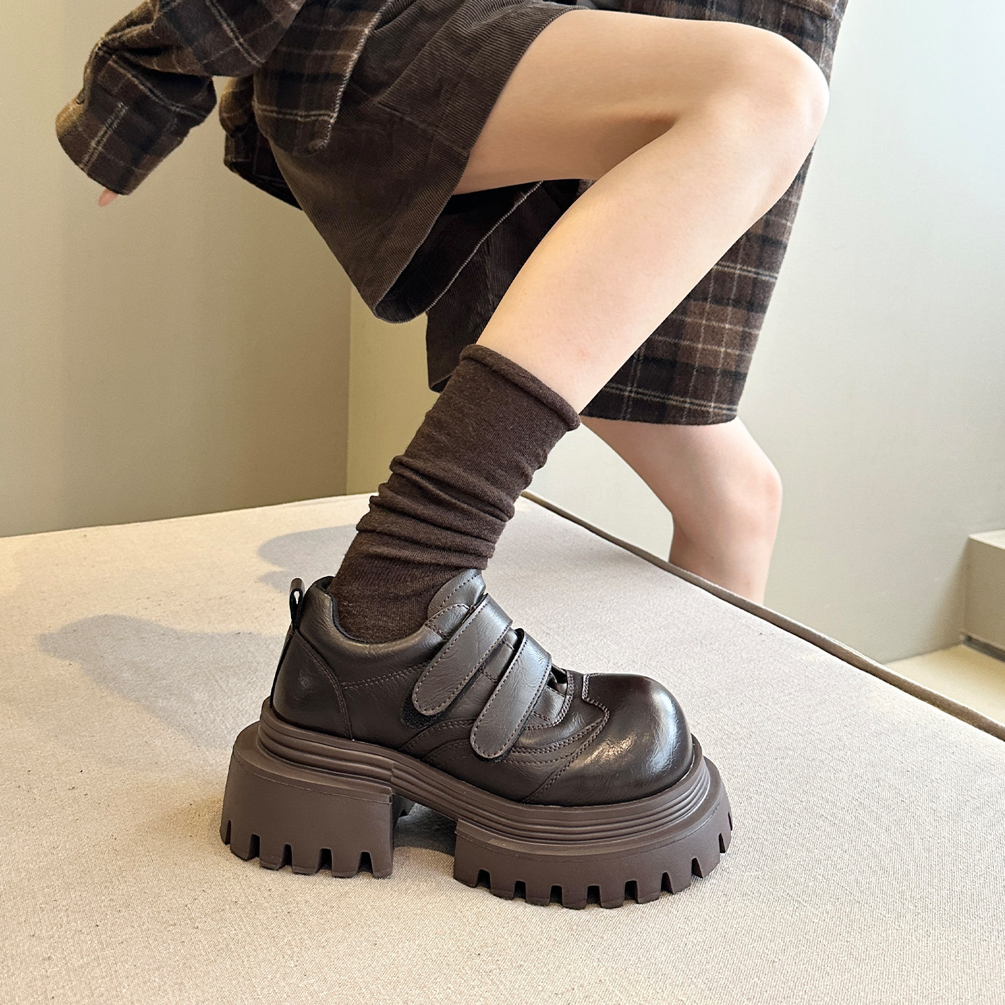甜酷时髦+日系辣妹配阔腿裤真皮大头增高厚底鞋德比鞋女鞋小皮鞋
