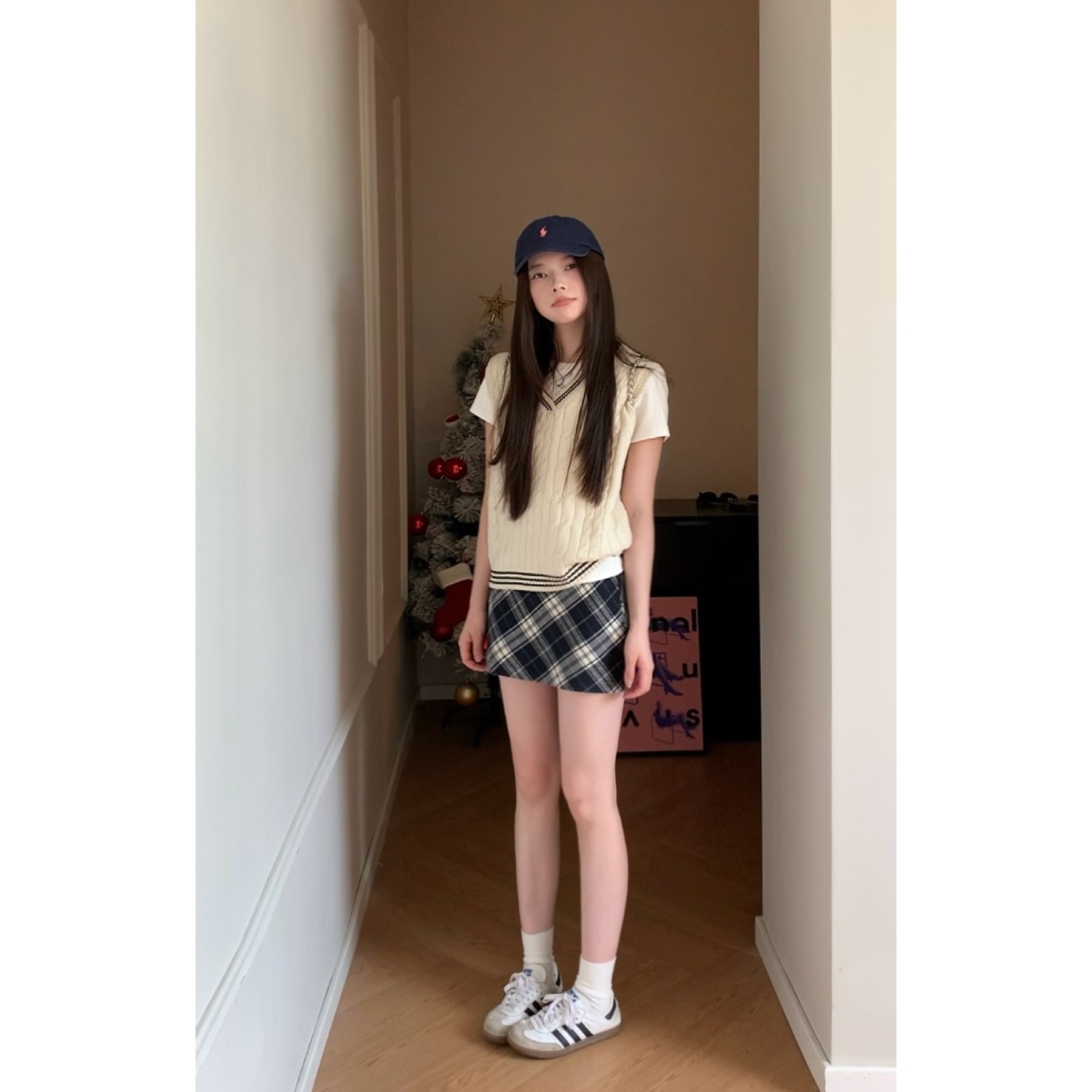 Viiwen 复古黑胶 显瘦韩系百搭设计感秋季包臀a字格纹短裙半身裙