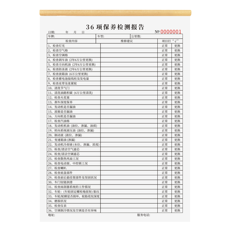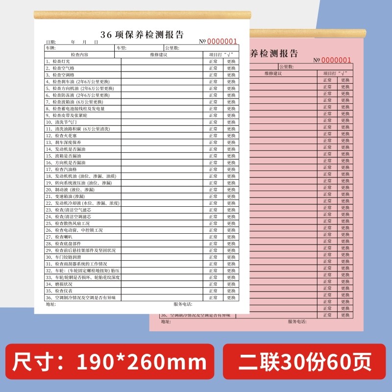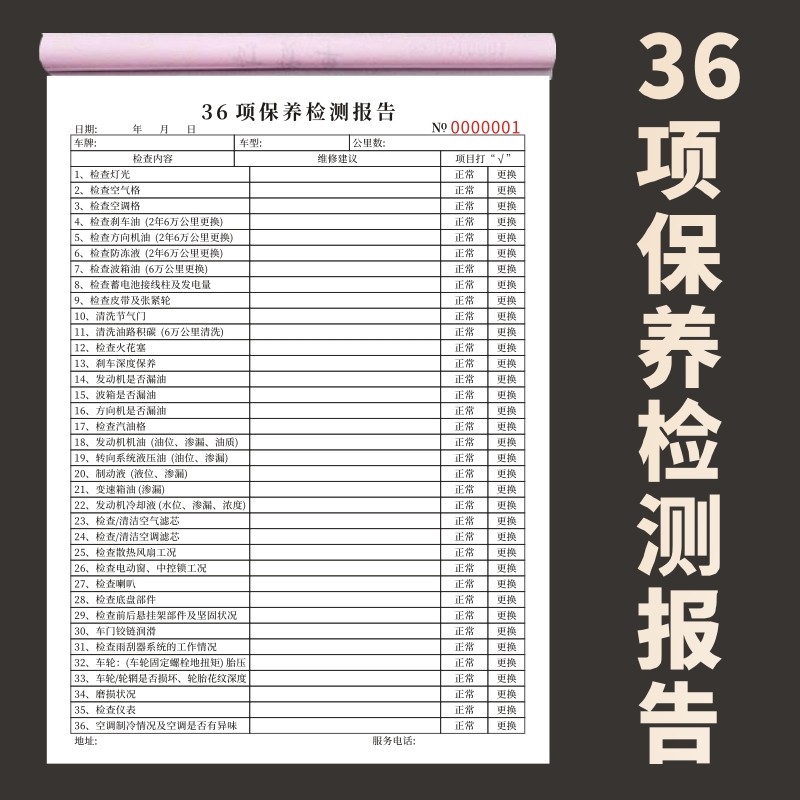 36项保养检测报告免费项目检查表一联二联16K汽车车辆安全养护记录4S店车辆维修清单叉车日常检查表通用定制