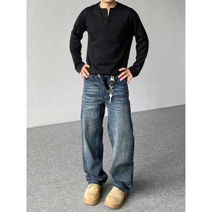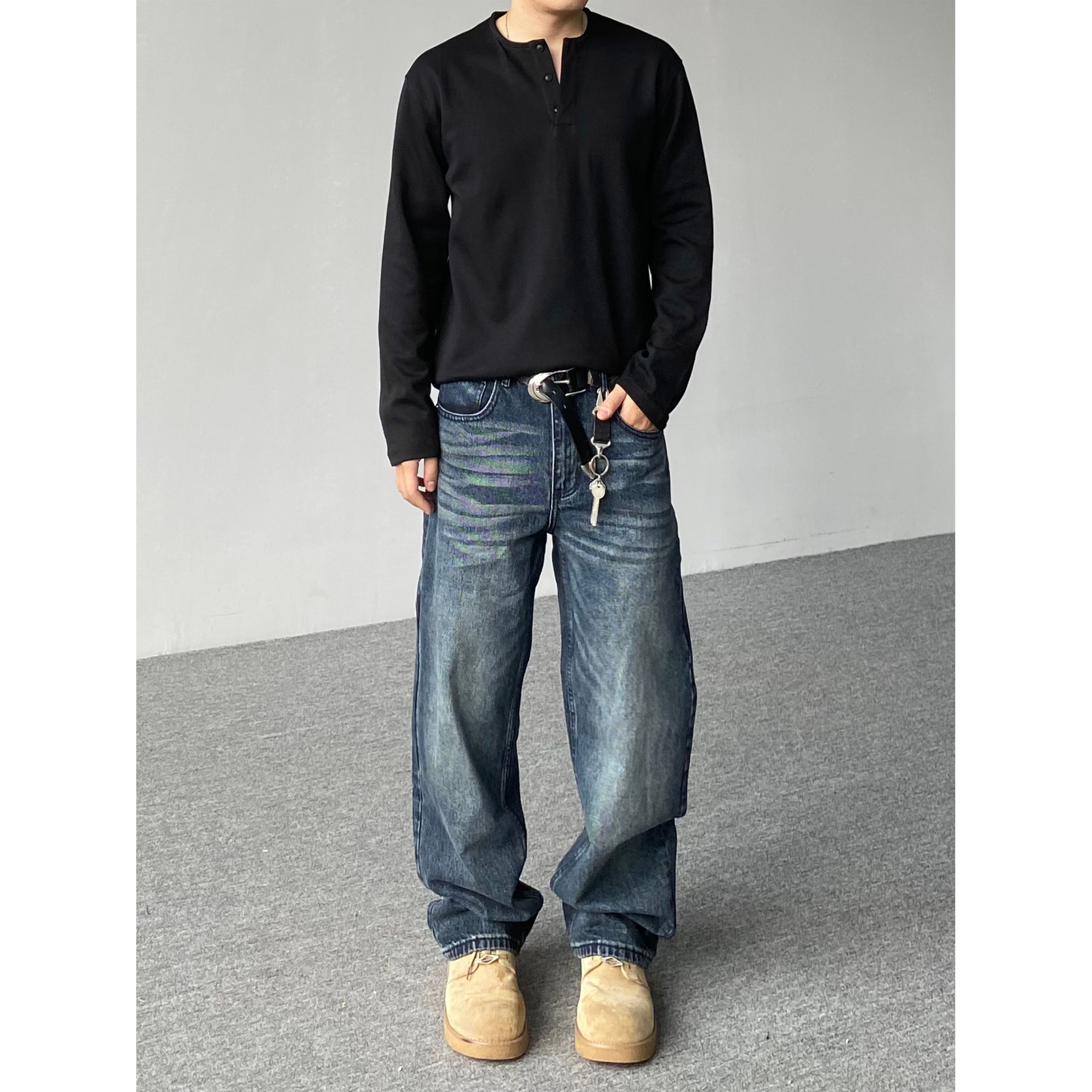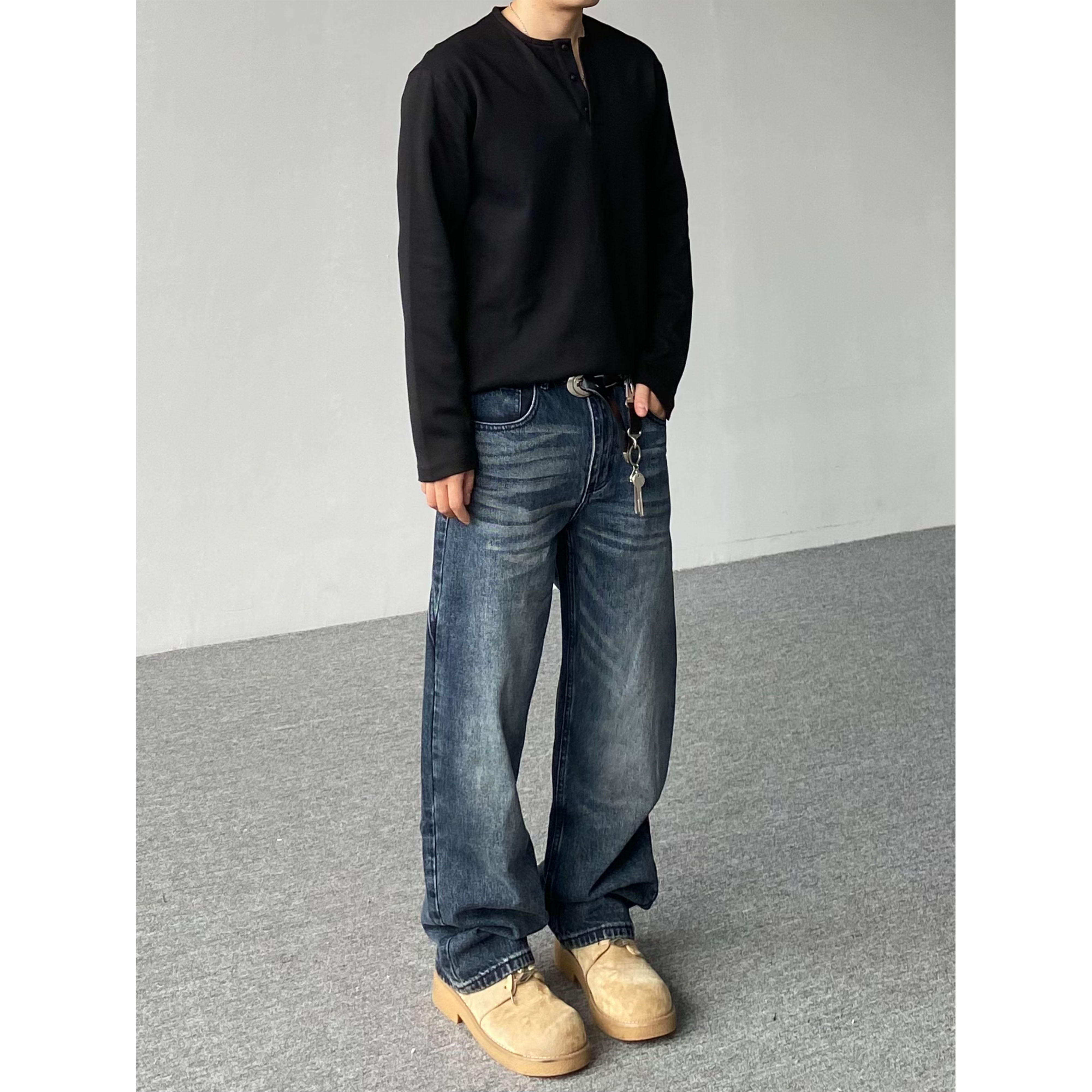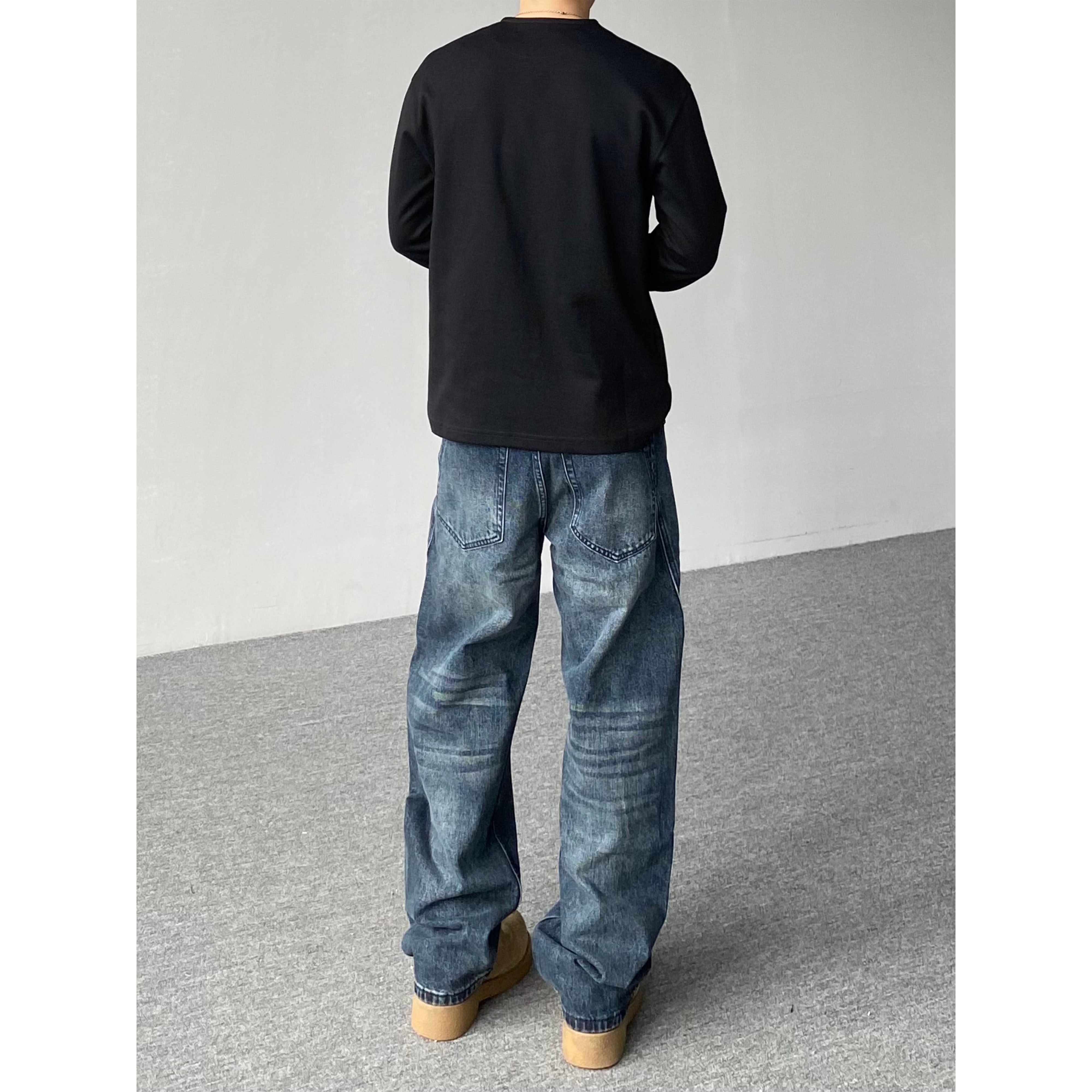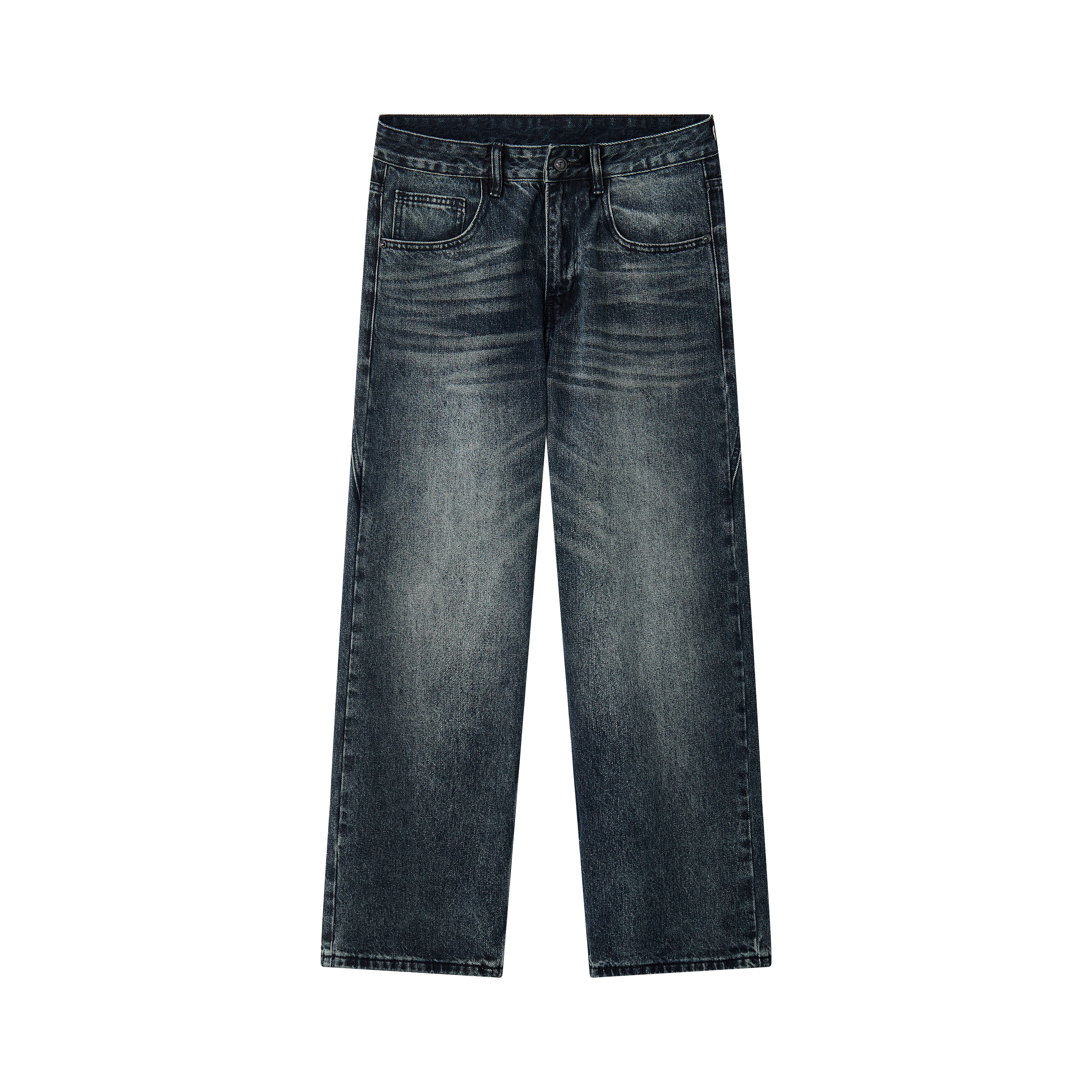 98SQUID 美式复古深色水洗猫须牛仔裤男女宽松直筒百搭休闲长裤潮